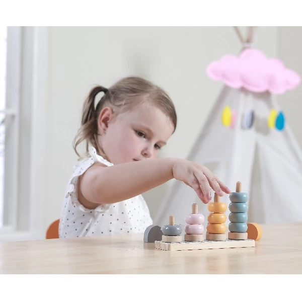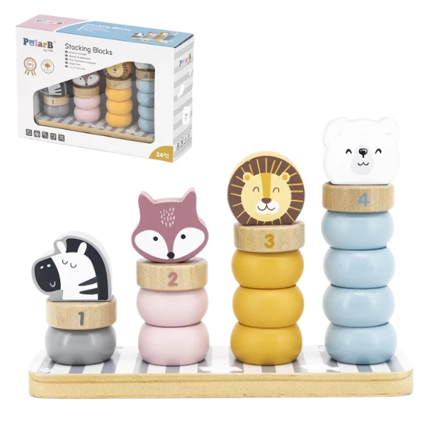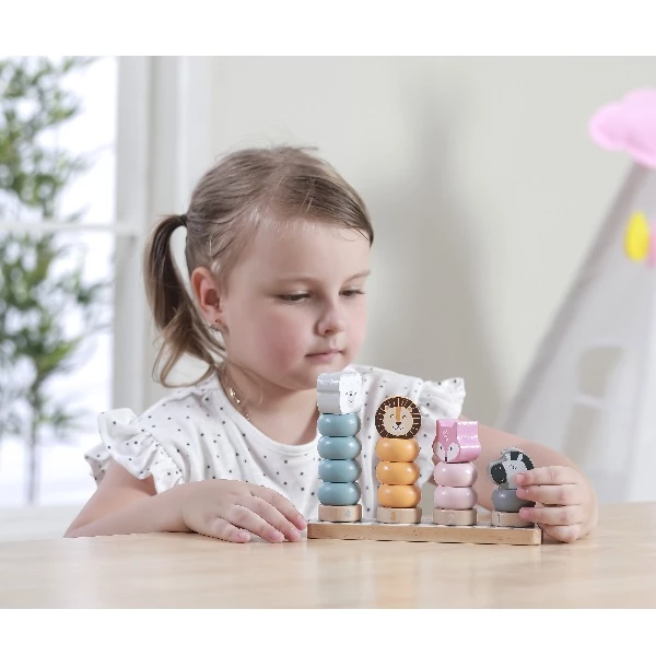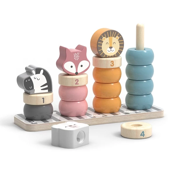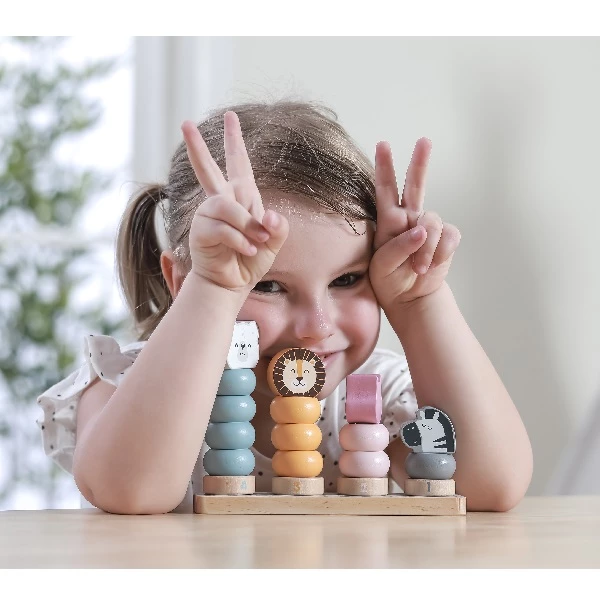 Игровой набор сортер-пирамидка " состоит из деревянной основы с четырьмя столбиками, на которые надеваются элементы различных форм и цветов. Каждая башня символизирует животное: лиса, лев, зебра и белый медведь. Элементы наборов окрашены в пастельные тона и безопасны для ребенка. Игрушка подходит для детей от 24 месяцев.