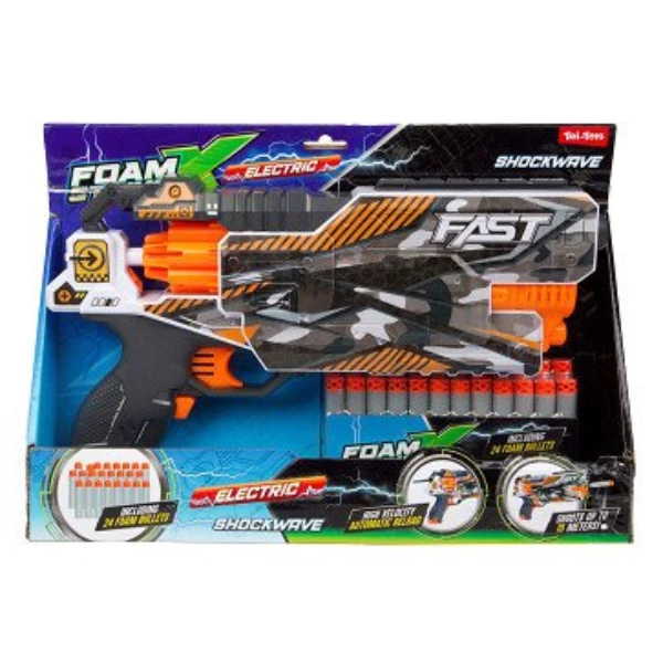 Подарите ребёнку захватывающие и динамичные стрелковые игры!Электрический бластер  стреляет мягкими пулями автоматически, превращая игру в настоящее приключение. В комплект входят 24 пули из безопасного мягкого материала, чтобы устраивать дуэли и развивать меткость.