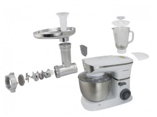 Food Processor Esperanza COOKING MASTER EKM025 1000W 5L ; Protection class: I; Power consumption: 1000 W; Stainless steel bowl capacity: 5L; 6 Speeds with Pulse function; Continuous operation time with normal load: 12 minutes; Cool down time before next usage: 20 minutes; Metal dough hook, whisk and beater; Anti-slippery rubber feet; Automatic stop for overload protection; Anti-splash protection; Blender set ( 1.5L mixing glass jug with 6-piece-knife, lid, cap); Meat grinder set (pusher, filling tray, spiral housing, spiral shaft, knife, 3 pieces of steel discs, sausage attachment, 2-part