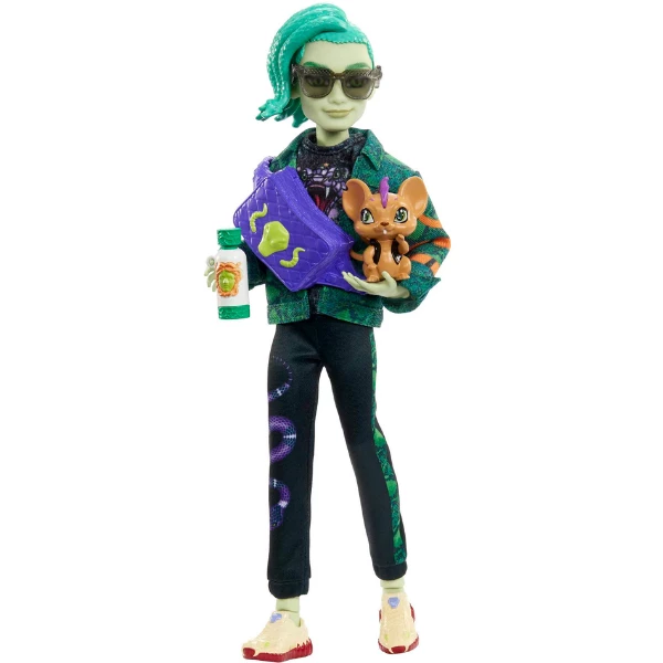 С графической футболкой, курткой с принтом под кожу змеи и брюками с змеиным узором кукла Deuce Gorgon демонстрирует устрашающе модный стиль. Очки в стиле тонированных и фантастические кроссовки дополняют образ. Змеиные волосы не являются оправданием для "утреннего петушка", поэтому кукла Deuce Gorgon всегда имеет под рукой баночку с воском для волос из змей - идеальное средство для создания его узнаваемой прически. Фиолетовая поясная сумка отлично подходит для хранения монструозно важных вещей: чешуйчатого фартука для рабочих смен в "Кофейне гробовщика", декоративной бутылки для воды, змеиных деталей смартфона и кекса для поддержания энергии в движении! Маленький, но могучий, Персей - его любимый мышонок, который всегда рядом в увлекательных приключениях, вызывающих дрожь в спине.