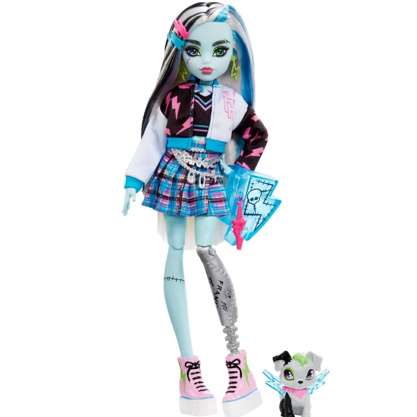 Кукла Фрэнки Штейн одета вызывающе: клетчатая юбка, блузка с принтом в виде молний и пугающе-шикарный жилет. Великолепные детали включают массивные кроссовки на платформе, ремень с цепочкой и солнцезащитные очки с молниями, серьги и заколки для волос. Образ куклы Фрэнки Штейн обретает новый уровень с помощью яркой университетской куртки и причудливых аксессуаров, таких как рюкзак в форме молнии, инста-камера, пицца и смартфон. Она всегда рядом с ее жутко-милым питомцем Уотзи!