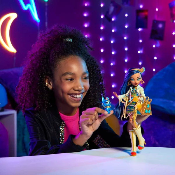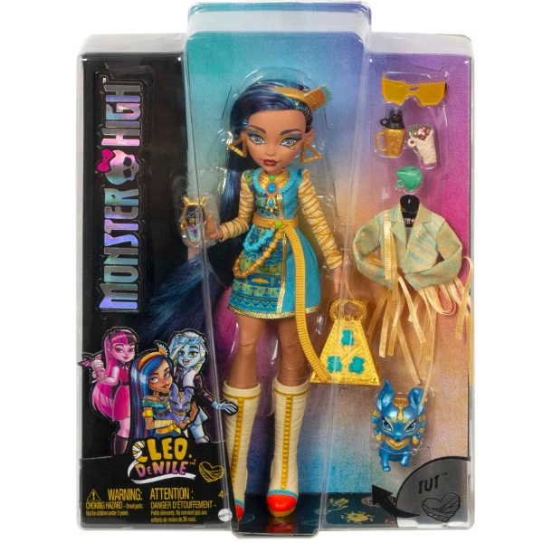Кукла Monster High Клео — дочь Мумии. Кукла имеет модный наряд, подчеркивающий оригинальный стиль ее героини. Модница Клео выглядит ужасно-блестяще, одетая в голубовато-золотистое платье с длинными рукавами, напоминающими обмотки мумии, и очень стильный пояс-цепочка. Ее изящный стиль дополняют такие аксессуары как высокие сапоги в тон одежды, безумно крутые бусы, серьги, гламурные солнцезащитные очки. А чтобы придать ей большую индивидуальность в наборе есть также роскошная куртка, рюкзак-пирамида, украшенный скарабеями, бурито, напиток, смартфон и палетка косметики. Не менее милым выглядит ее маленький любимец — Тут!