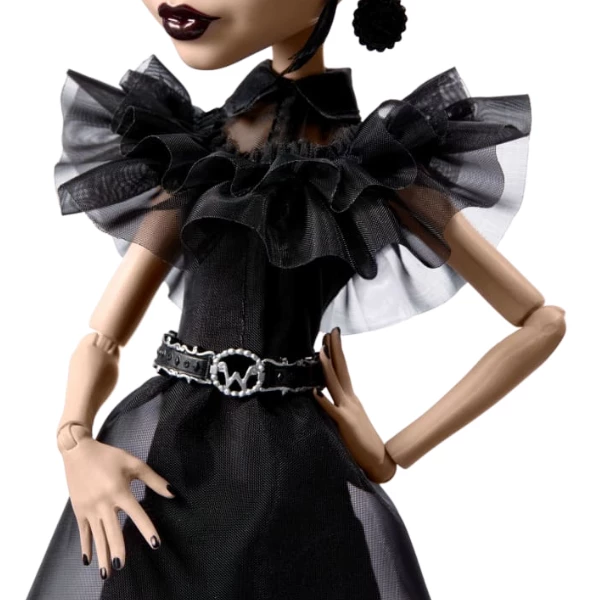 Готическая роскошь:• Уэнсдэй облачена в потрясающее черное платье из органзы с объемными рюшами, словно сотканными из теней.• Эффектный пояс с пряжкой Monster High подчеркивает её элегантный силуэт.• В качестве акцента – серьги в стиле Monster High, завершающие мрачный, но изысканный образ.