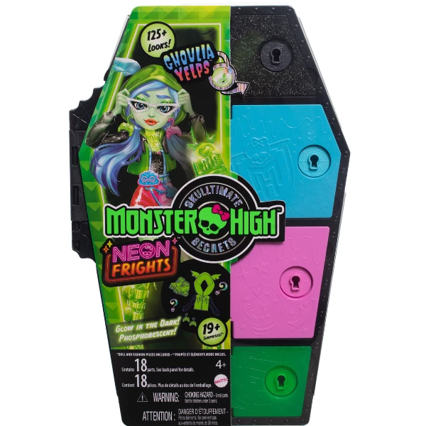 Skulltimate Secrets возвращается и светится, как никогда раньше! Откройте шкафчик куклы Ghoulia Yelps, чтобы обнаружить фэшн сюрпризы и мрачно-шикарные аксессуары в стиле Neon Frights.