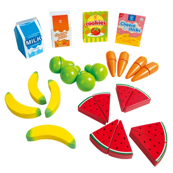 В комплекте: прилавок, касса с функцией сканера, 25 купюр, 2 кредитные карты, 4 банана, 4 морковки, 4 кусочка арбуза, 4 груши, 1 пакет печенья, 1 пакет сыра, 1 пакет апельсинового сока, 1 пакет молока, корзина из фетра, холщовая сумка.