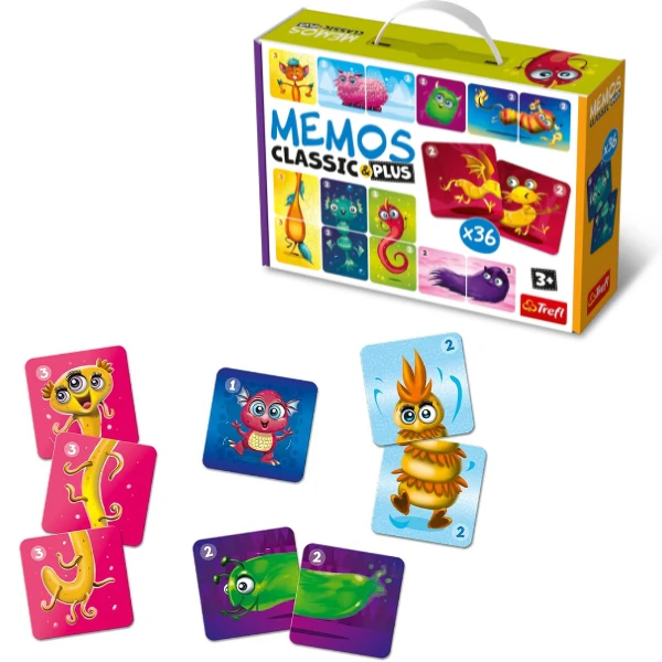 Trefl Memos Classic & Plus "Monștri drăguți" este un joc educativ de memorie pentru copii mici, care oferă mai multe variante de joc și niveluri diferite de dificultate.