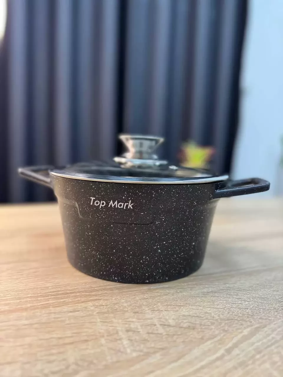 Кастрюля для приготовления пищи изготовлена из мельчайших частиц мраморного камня и покрыта антипригарным слоем. Во время готовки продукты не прилипают к внутренней поверхности кастрюли. Это покрытие в десять раз прочнее и долговечнее тефлоновых аналогов. Оно является улучшенной версией тефлона и не подвержено царапинам или повреждениям при мытье.