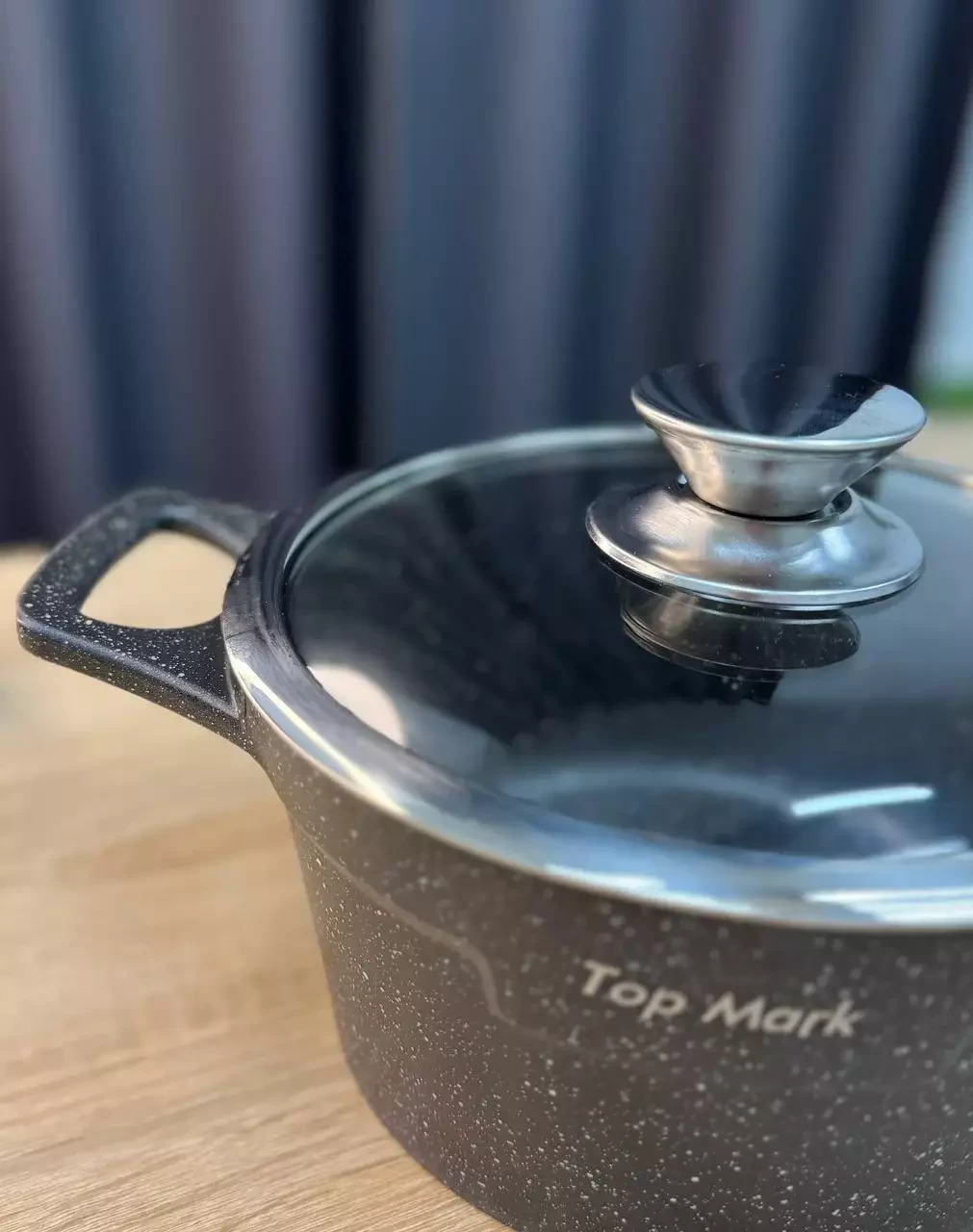 Антипригарное мраморное покрытие выполнено из литого толстостенного алюминия, который не вступает в контакт с пищей. Крышка изготовлена из толстого жаропрочного стекла, что позволяет легко контролировать процесс приготовления. Ручка крышки выполнена из деревянного материала, благодаря чему вы не обожжёте руку во время снятия крышки при готовке.
