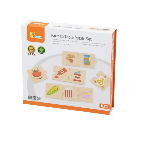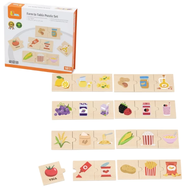 VIGA Набор пазлов "От фермы до стола" в увлекательной форме учит детей тому, как растительные продукты превращаются во вкусные продукты питания. Сопоставляя растения и урожай с готовыми продуктами, такими как попкорн, хлопья, арахисовое масло или макароны, малыши узнают, откуда берутся эти повседневные лакомства. Такая игра развивает понимание процессов, связанных с производством пищи, и пробуждает интерес к этапам переработки урожая.