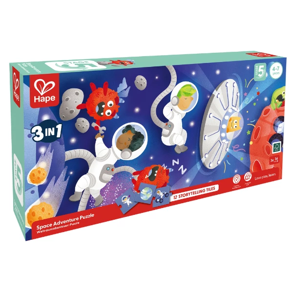 В набор входят 3 пазла (всего 108 деталей), 12 карточек для сторителлинга и удобный постер-образец, который можно использовать как подсказку или повесить на стену.