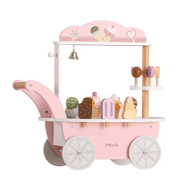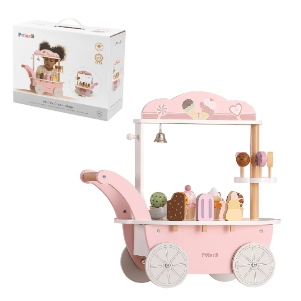 Тележка оснащена 4 большими колесами и удобной ручкой для транспортировки. Магазин выполнен в нежных бело-розовых тонах и оснащен серебристым колокольчиком для привлечения внимания. В витрину вставляются яркие десерты: мороженое и леденцы на палочках, а также бутылочка с топпингом. Каждый шарик мороженого имеет магнит, который крепится к рожку, что делает игру более реалистичной. В задней части тележки предусмотрен ящик для хранения монет, что помогает детям считать доходы и поддерживать порядок в кассе.