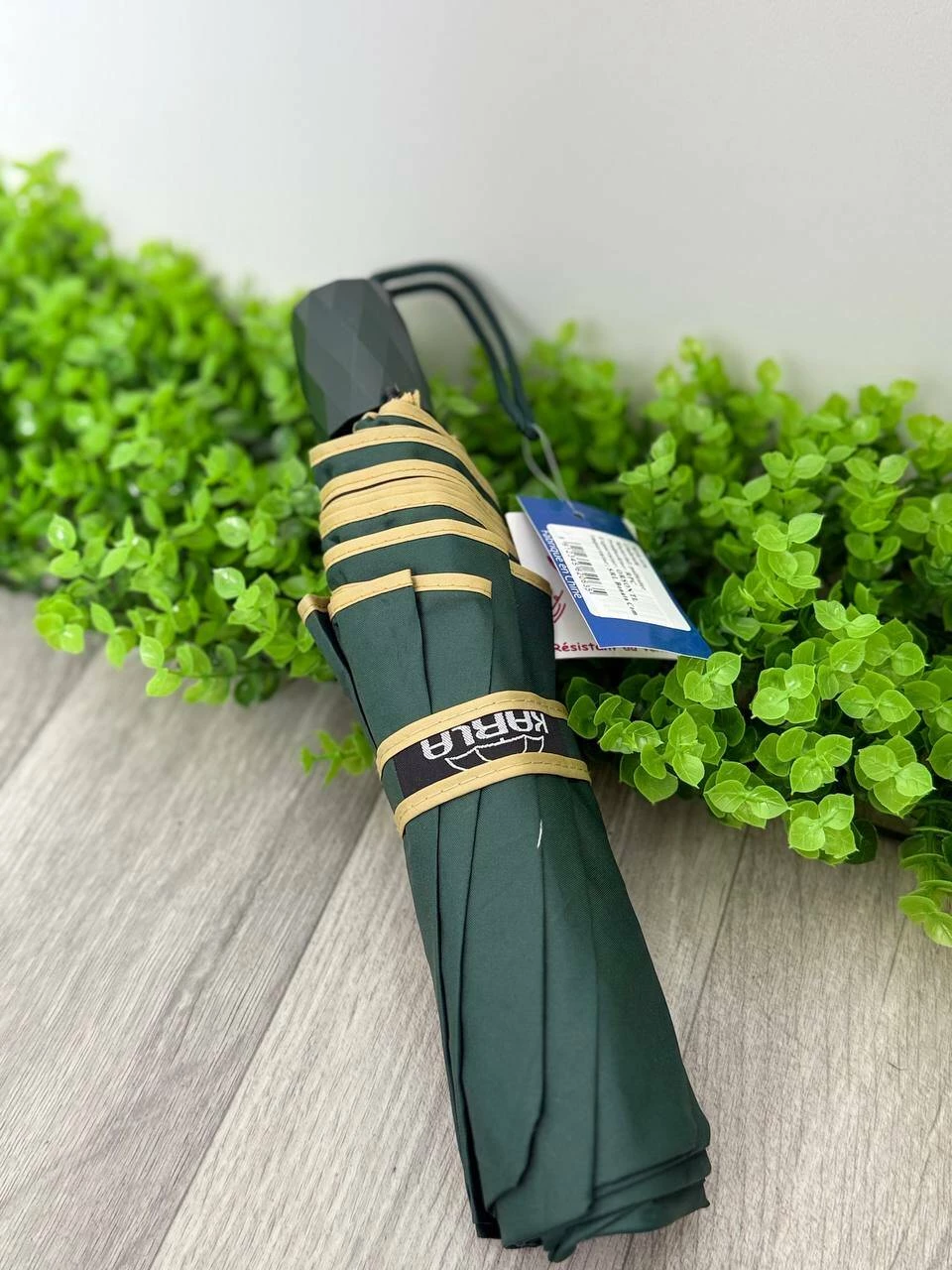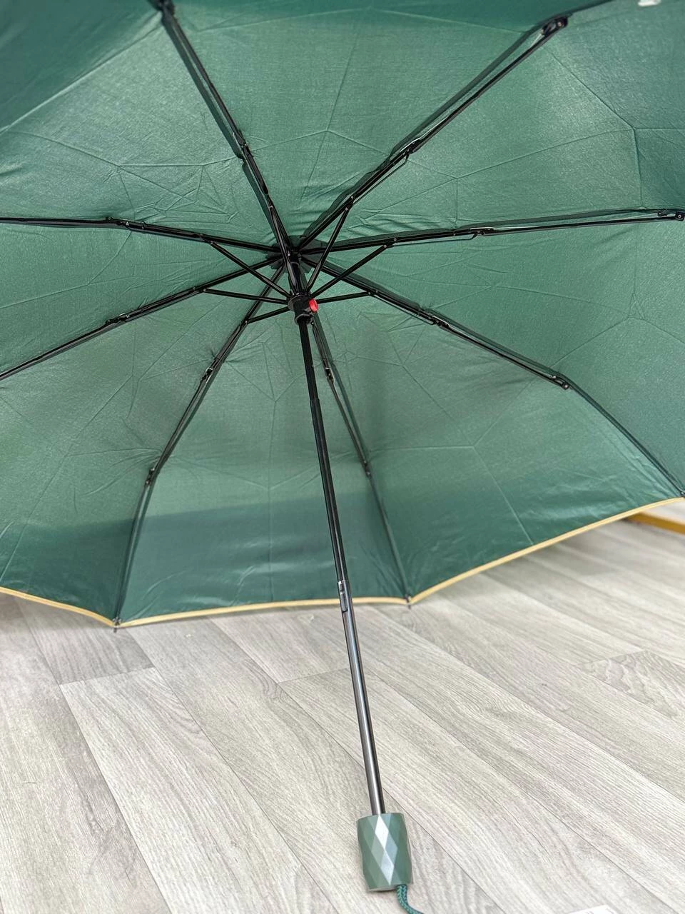 Практичный и стильный зонт тёмно-зелёного цвета с бежевой окантовкой и удобной ручкой с бриллиантовым дизайном. Лёгкий и компактный, легко помещается в сумку или рюкзак. Надёжно защищает от дождя и ветра. Подходит как для девушек, так и для парней. В комплекте есть чехол.