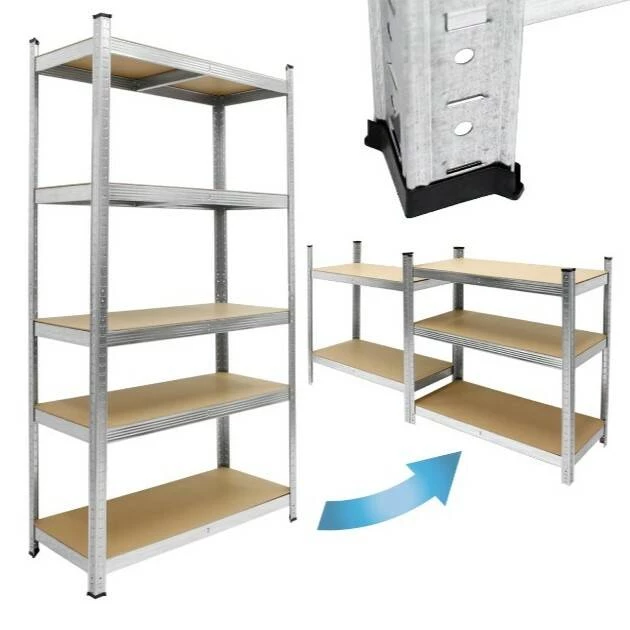 Оцинкованный стеллаж с 5 прочными полками, изготовлен из стали и МДФ, идеально подходит для хранения и организации. Легко собирается и разбирается без винтов — система на клипсах.