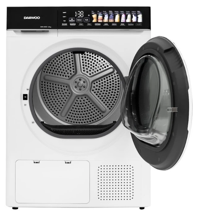 Uscator de rufe Daewoo DDR-HS9E-1, 9 kg, Clasa E, Control electronic, Pompa de caldura, butoane touch, panou de control negru cu pictograme mari col