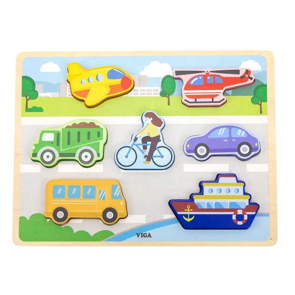 Деревянные пазлы VIGA — это идеальная развивающая игрушка для детей от 18 месяцев. Набор состоит из красочной доски и 7 тщательно выполненных элементов с изображением различных транспортных средств. Каждый элемент имеет своё место на доске, что помогает ребёнку развивать навыки сопоставления и логическое мышление.