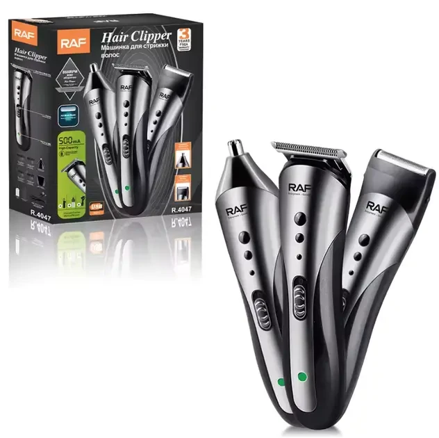 Набор RAF R.4047 3 в 1 — универсальное решение для комплексного ухода за внешностью дома или в дороге. В комплект входят машинка для стрижки волос, триммер для бороды и усов, а также триммер для носа и ушей — всё необходимое для аккуратного внешнего вида без посещения салона.