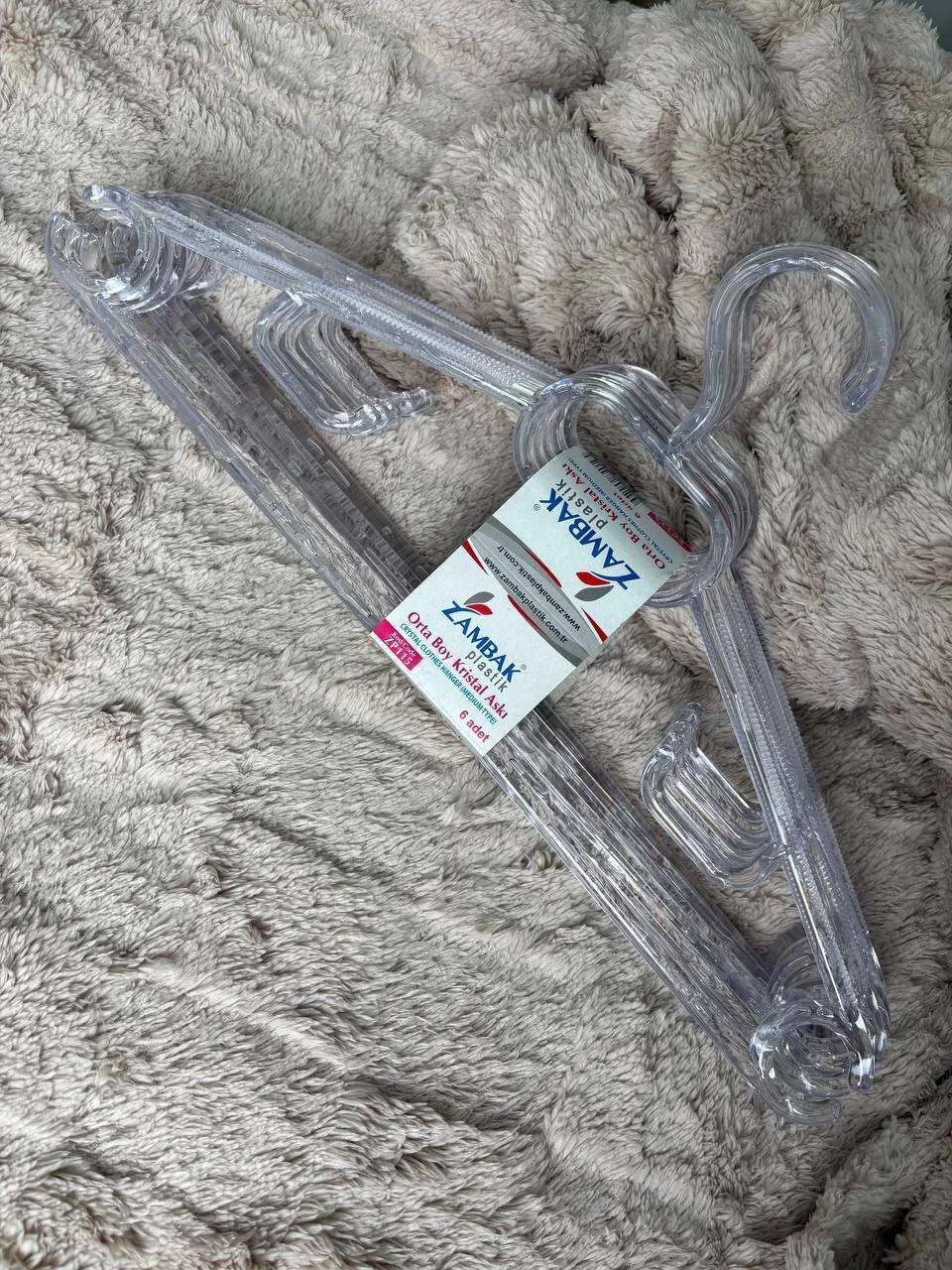 Набор из 6 прозрачных вешалок среднего размера, изготовленных из прочного пластика (кристалл). Подходят для повседневной одежды, рубашек, пиджаков и блуз. Практичный дизайн с боковыми крючками предотвращает соскальзывание одежды.