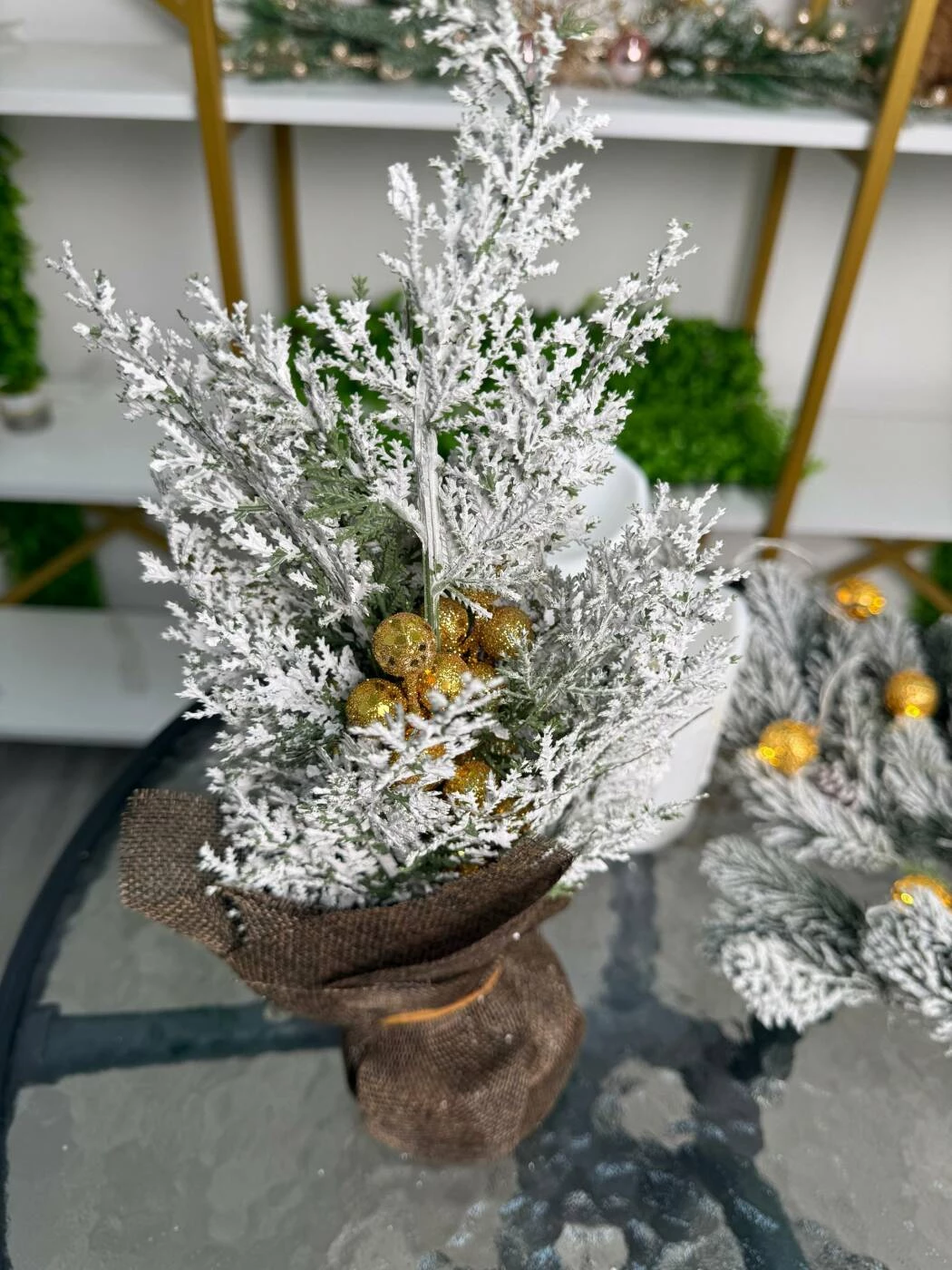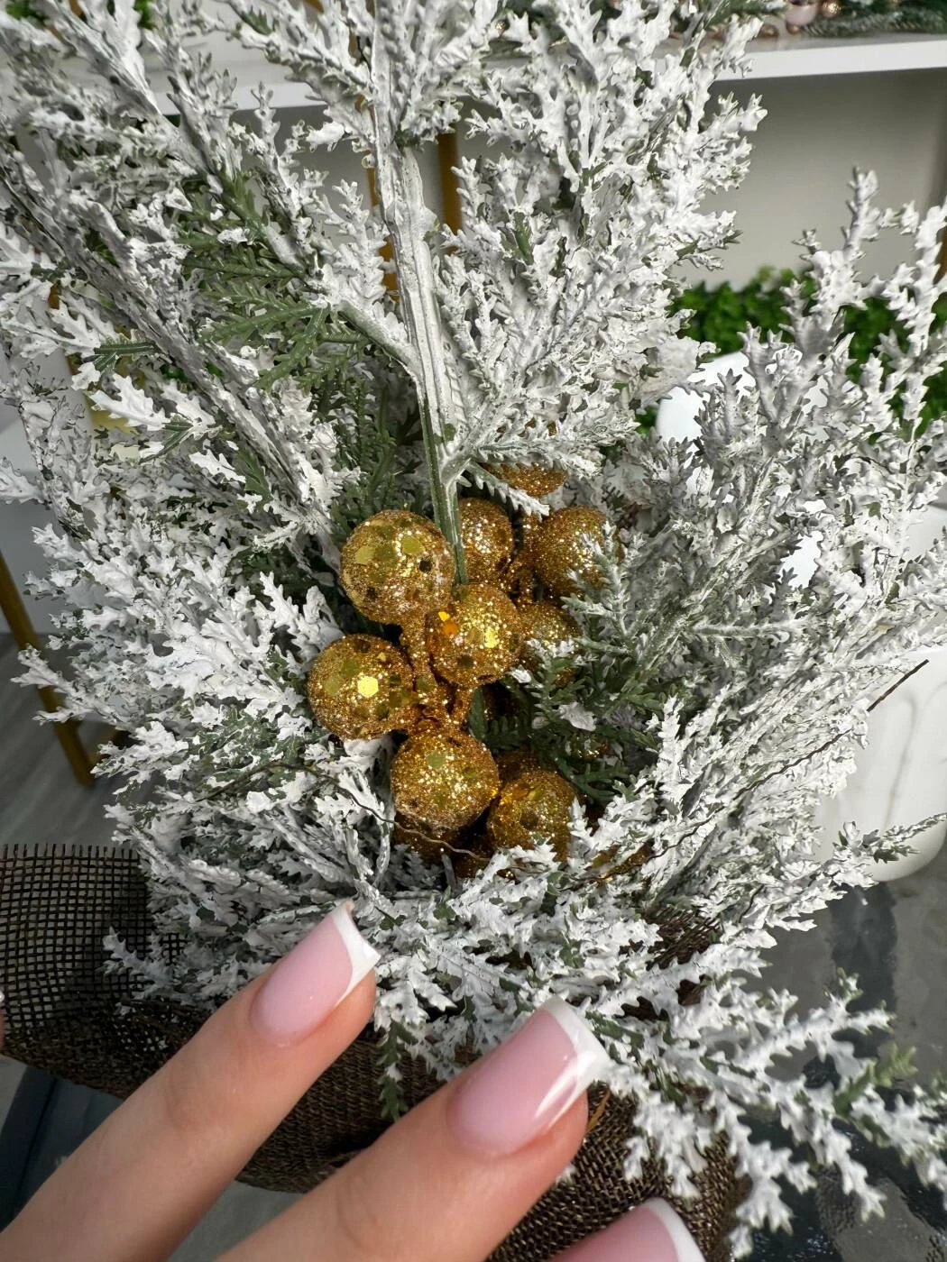 Un decor elegant de iarnă care aduce farmecul sărbătorilor în orice colț al casei. Brăduțul este realizat din ramuri artificiale cu efect realist, acoperite cu un strat fin de „zăpadă” decorativă, completat de accente aurii care adaugă o notă sofisticată.
