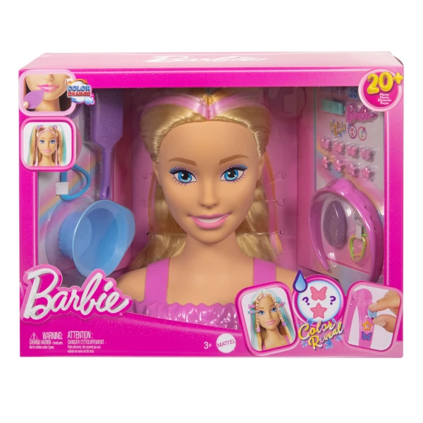 Devino un expert în coafuri cu păpușa Barbie Doll Styling Head! Barbie are păr blond cu șuvițe pastelate roz, portocaliu și turcoaz.