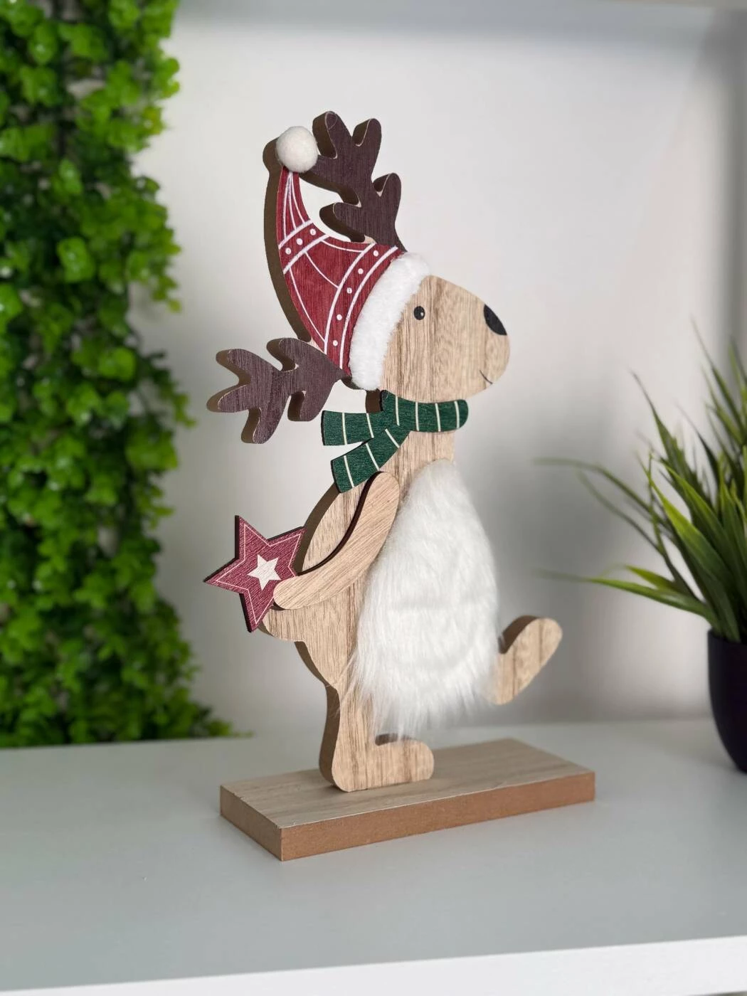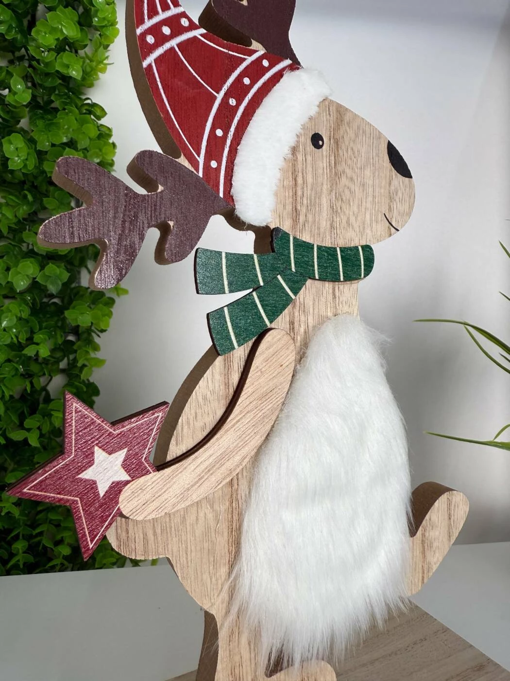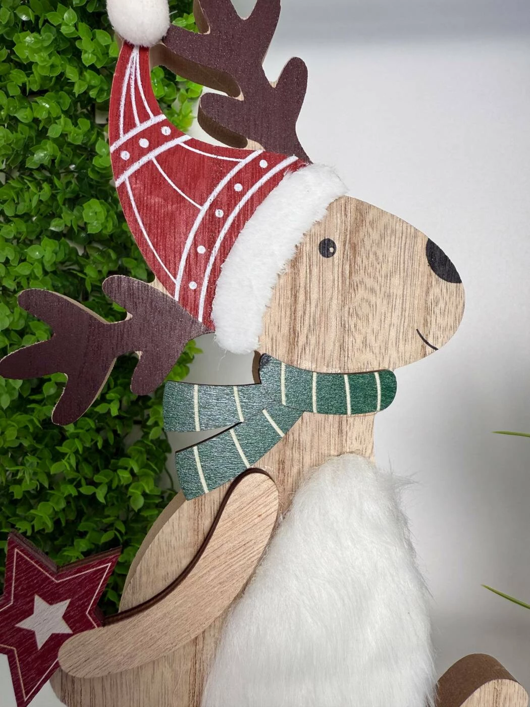 Această decorațiune de Crăciun sub formă de ren aduce un strop de bucurie și căldură în decorul sărbătorilor. Confecționat din lemn cu finisaje fine, renul este decorat cu pălărie roșie festivă, fular verde și blăniță albă moale, detalii care îi conferă un aspect adorabil și elegant.