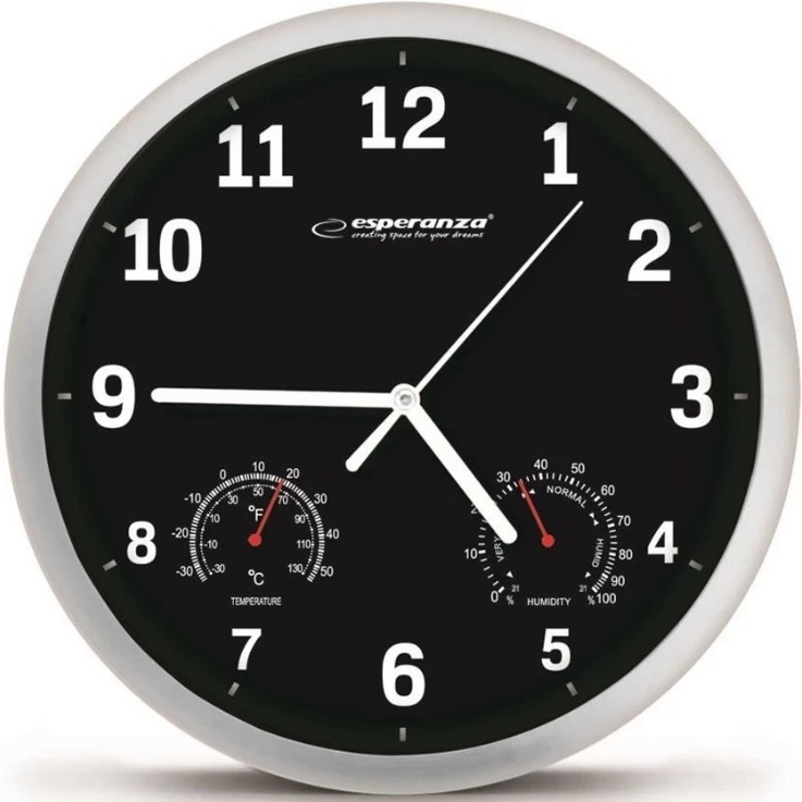 Clock Wall Esperanza LYON EHC016K Black, 25 cm, plastic frame, Quiet movement, hook for easy installation, Measurements: temperature and humidity, P