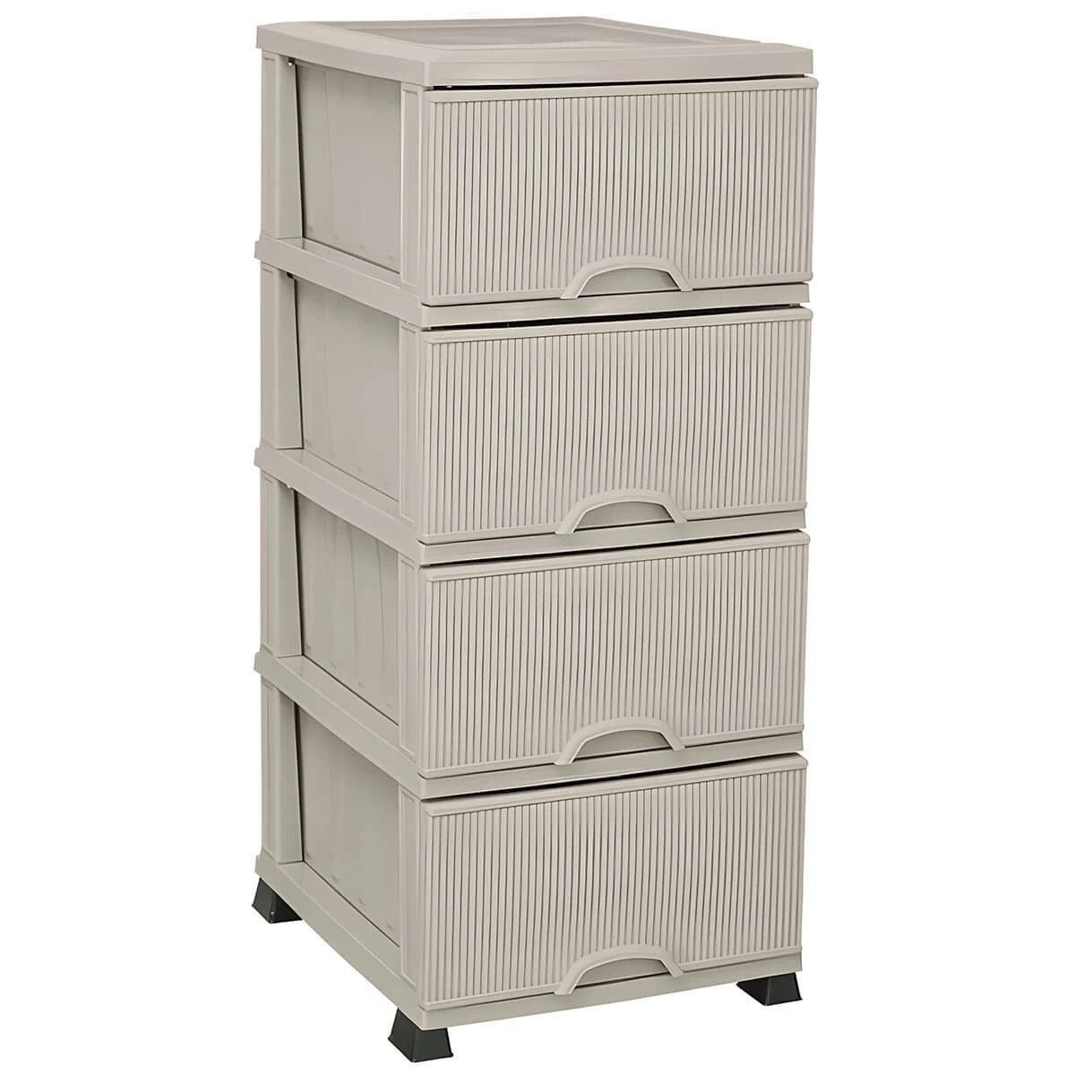Este dotat cu 4 sertare încăpătoare, ideale pentru haine, jucării, accesorii, documente sau produse de uz zilnic. Materialul din plastic rezistent asigură durabilitate, protecție împotriva umidității și o utilizare confortabilă pe termen lung.