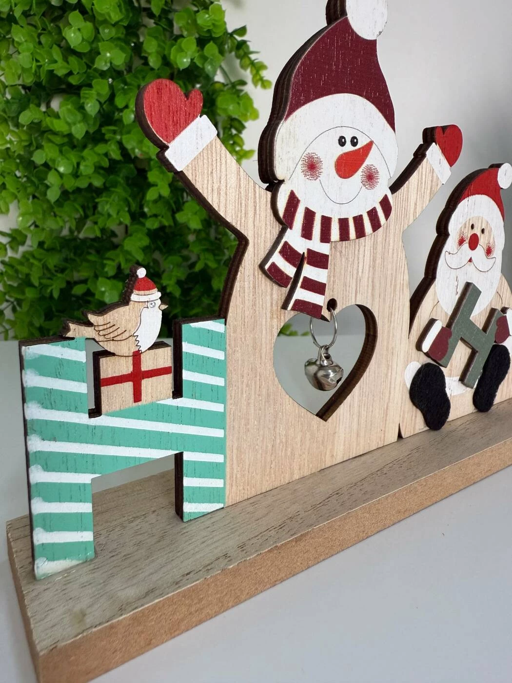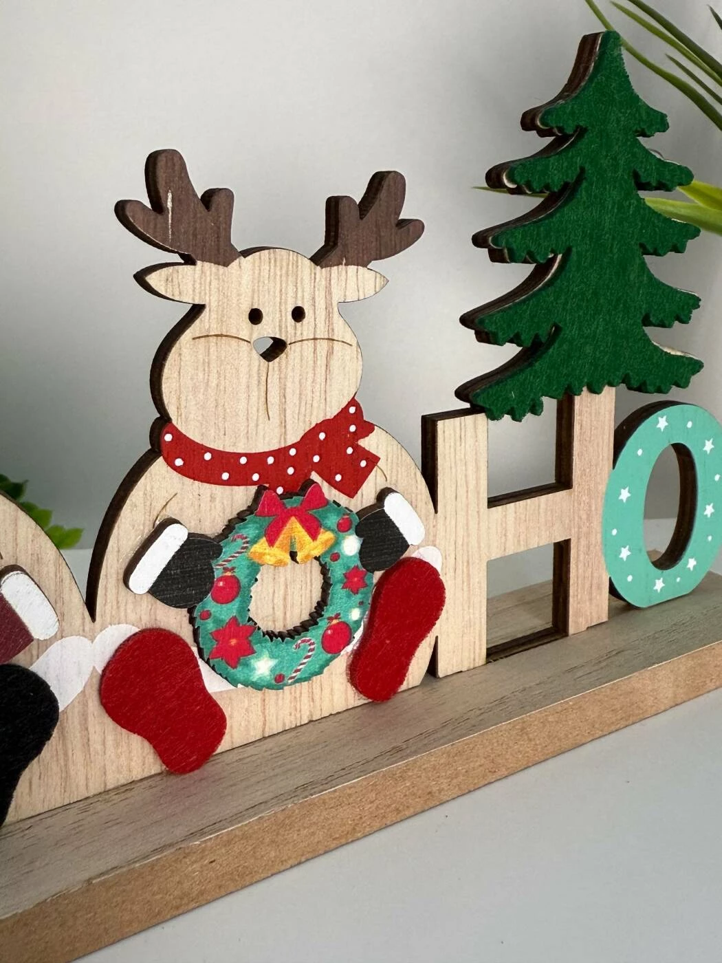 Această decorațiune de Crăciun din lemn este alegerea perfectă pentru a adăuga o notă veselă și plină de culoare decorului tău festiv. Modelul prezintă literele „HO HO HO”, completate de Moș Crăciun, un om de zăpadă zâmbitor și un ren adorabil, toate realizate cu detalii minuțioase și accente colorate.