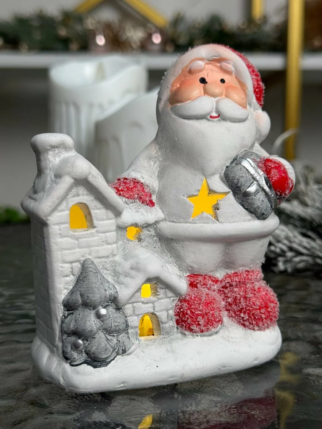 O figurină decorativă plină de farmec, perfectă pentru a aduce magia sărbătorilor în casa ta! Această decorațiune din ceramică îl înfățișează pe Moș Crăciun alături de o căsuță acoperită de zăpadă, luminată discret din interior pentru un efect cald și festiv. Realizată cu atenție la detalii și finisaje, decorațiunea se potrivește ideal pe masă, raft sau vitrină, oferind un accent elegant și tradițional decorului de Crăciun.