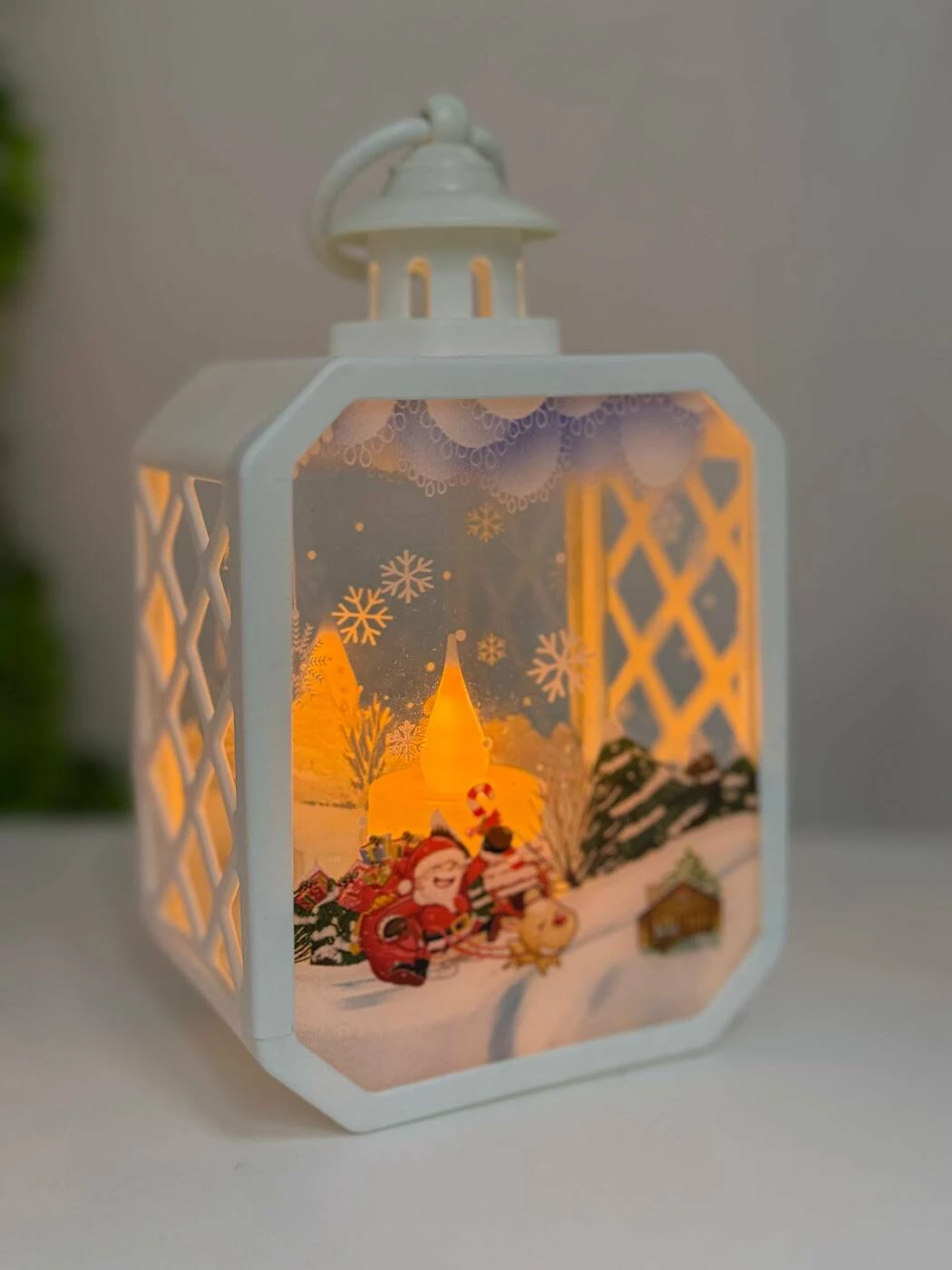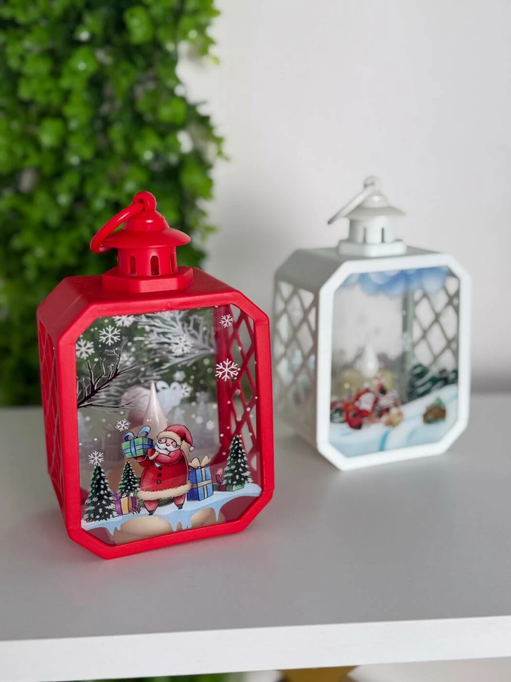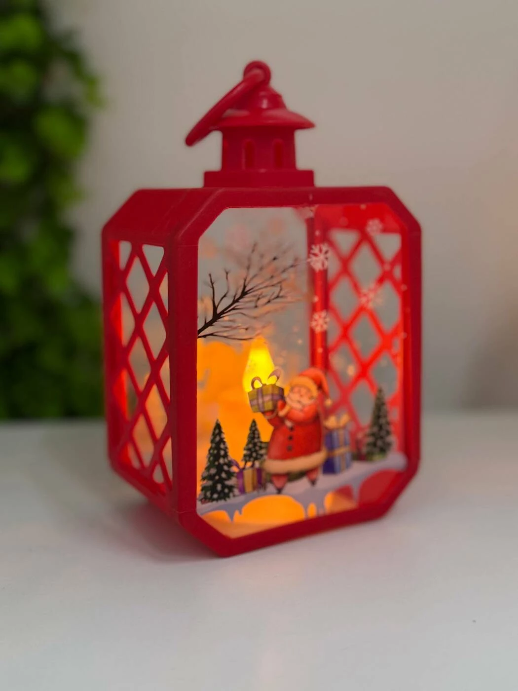 Felinarul decorativ cu lumină LED aduce în casă farmecul și căldura sărbătorilor de iarnă. Acesta are un design festiv cu Moș Crăciun, brăduți și peisaj de iarnă, luminat din interior de o lumânare LED galbenă, care creează o atmosferă caldă și primitoare.