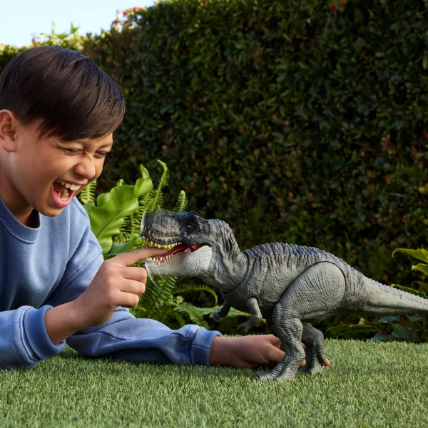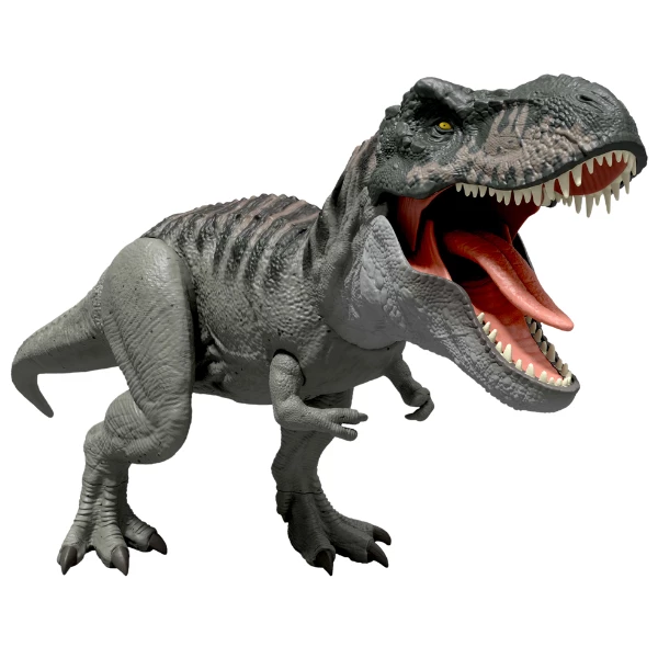 Figurina interactivă Tyrannosaurus rex, inspirată de filmul Jurassic World Rebirth, aduce în joc dinamica și acțiunea captivantă! Această jucărie interactivă dispune de funcția mușcătură repetată: apăsarea limbii declanșează un răget de victorie, iar menținerea limbii activează o serie continuă de mușcături, însoțită de efecte luminoase și sonore. Este perfectă pentru lupte cu alte figurine de dinozauri.