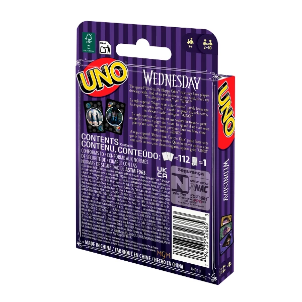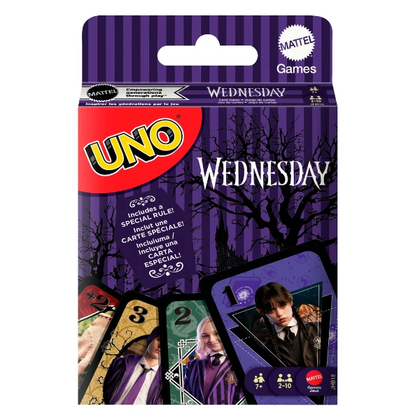 Intră în lumea serialului preferat Wednesday cu acest joc de cărți UNO tematic! Setul include un pachet cu ilustrații colorate cu personajele și scenele preferate, transformând fiecare rundă într-o adevărată aventură. Jucătorii potrivesc cărțile după culoare și număr, încercând să scape de toate cărțile din mână.