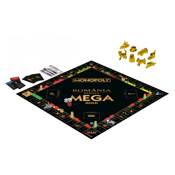 Descoperă o experiență unică cu Monopoly – România, Ediția Mega Gold! Această versiune specială aduce 12 spații suplimentare și 8 orașe noi, pentru o aventură mai mare pe harta României. Călătorește de la Craiova la Timișoara și până la Cluj, cumpără proprietăți și construiește-ți imperiul!