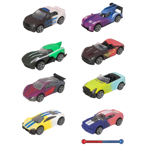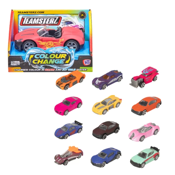 Această mașinuță din seria Teamsterz Street Kingz își schimbă culoarea! Mașinuța își schimbă culoarea în funcție de temperatură! Vrei ca mașinuța să-și schimbe culoarea? Pune-o în congelator sau scufundă în apă rece, aproape de 0 grade. Fiecare mașinuță are o lungime de aproximativ 10 cm, cu un corp metalic de înaltă calitate și roți independente care se rotesc liber.