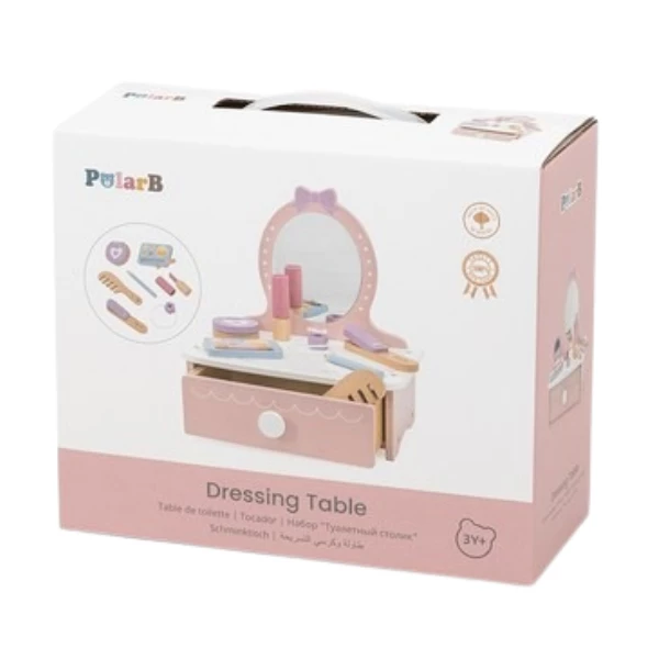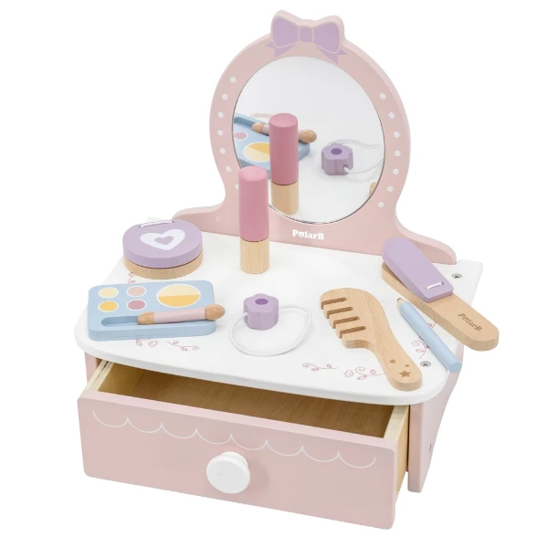 Această măsuță de toaletă elegantă din lemn de la Viga PolarB este alegerea perfectă pentru fiecare fetiță care iubește să se aranjeze și să se joace de-a salonul de frumusețe. Realizată în tonuri pastelate delicate și dotată cu o oglindă sigură, măsuța adaugă un plus de farmec camerei și oferă ore întregi de joacă creativă. Sertarul spațios este ideal pentru păstrarea accesoriilor și a micilor comori, iar setul variat de piese transformă joaca într-o adevărată experiență de frumusețe.