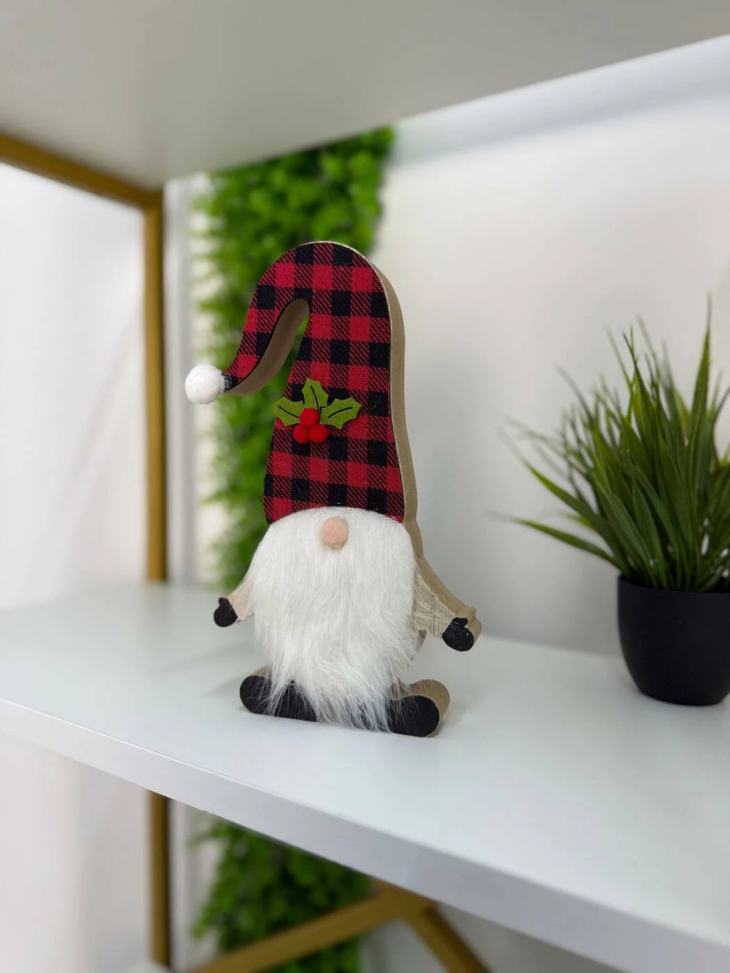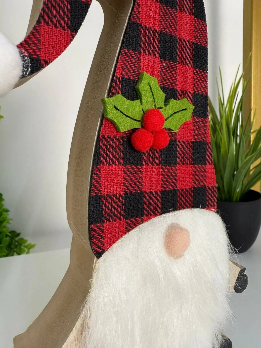 Această decorațiune de Crăciun din lemn îl înfățișează pe Moș Crăciun într-o formă modernă și elegantă, ideală pentru a completa atmosfera festivă a sărbătorilor. Cu o căciulă lungă roșie-neagră în carouri, detaliată cu frunzulițe verzi și bobițe roșii, și o barbă moale albă, acest Moș aduce un strop de căldură și veselie oricărui spațiu.
