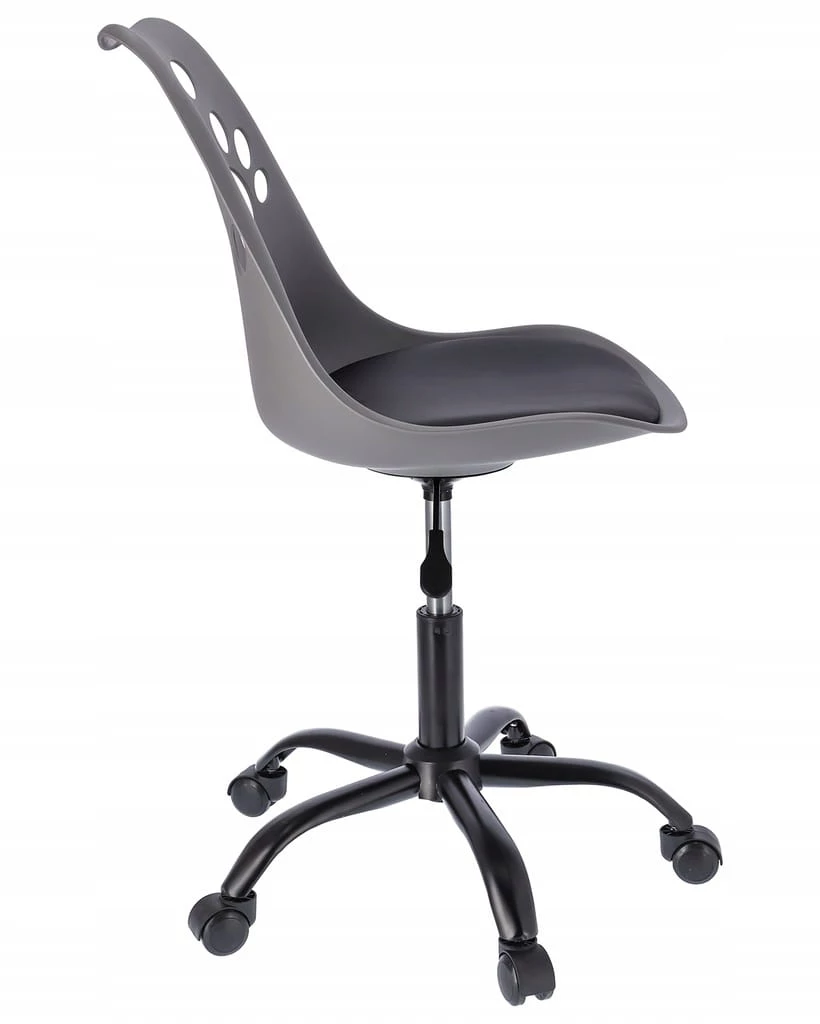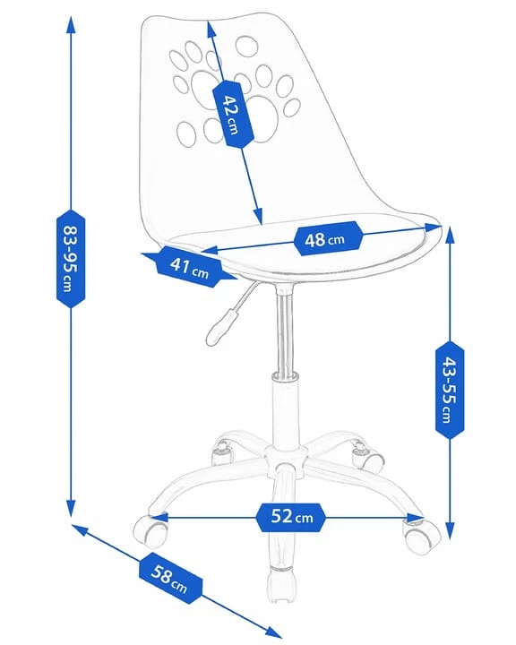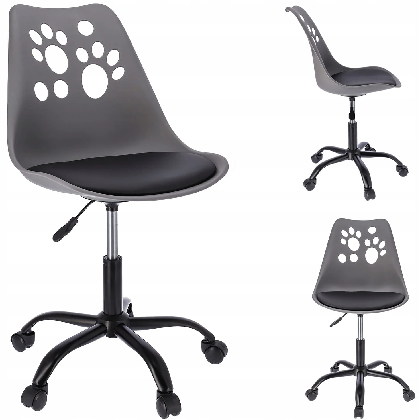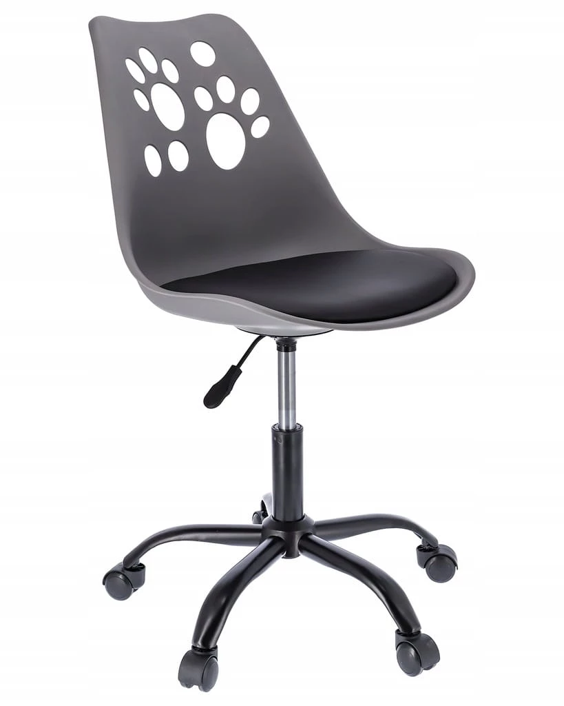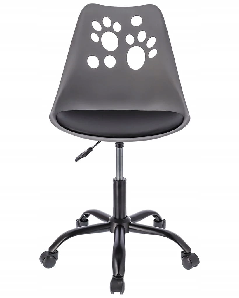 Scaun JOY – Confort și stil cu detalii jucăușeScaunul din colecția JOY se remarcă prin spătarul perfect conturat, decorat cu un motif inspirat de o labă de câine, adăugând un element original și prietenos designului. Pernă moale, din piele ecologică, amplasată pe șezut, oferă un confort sporit.Baza stabilă în cinci stele, prevăzută cu roți mici din plastic, asigură stabilitate excelentă și protejează podeaua împotriva zgârieturilor. Actuatorul permite reglarea simplă a înălțimii șezutului, adapt ...