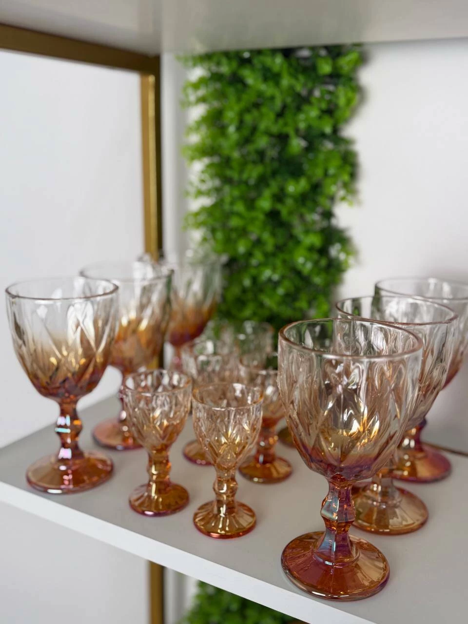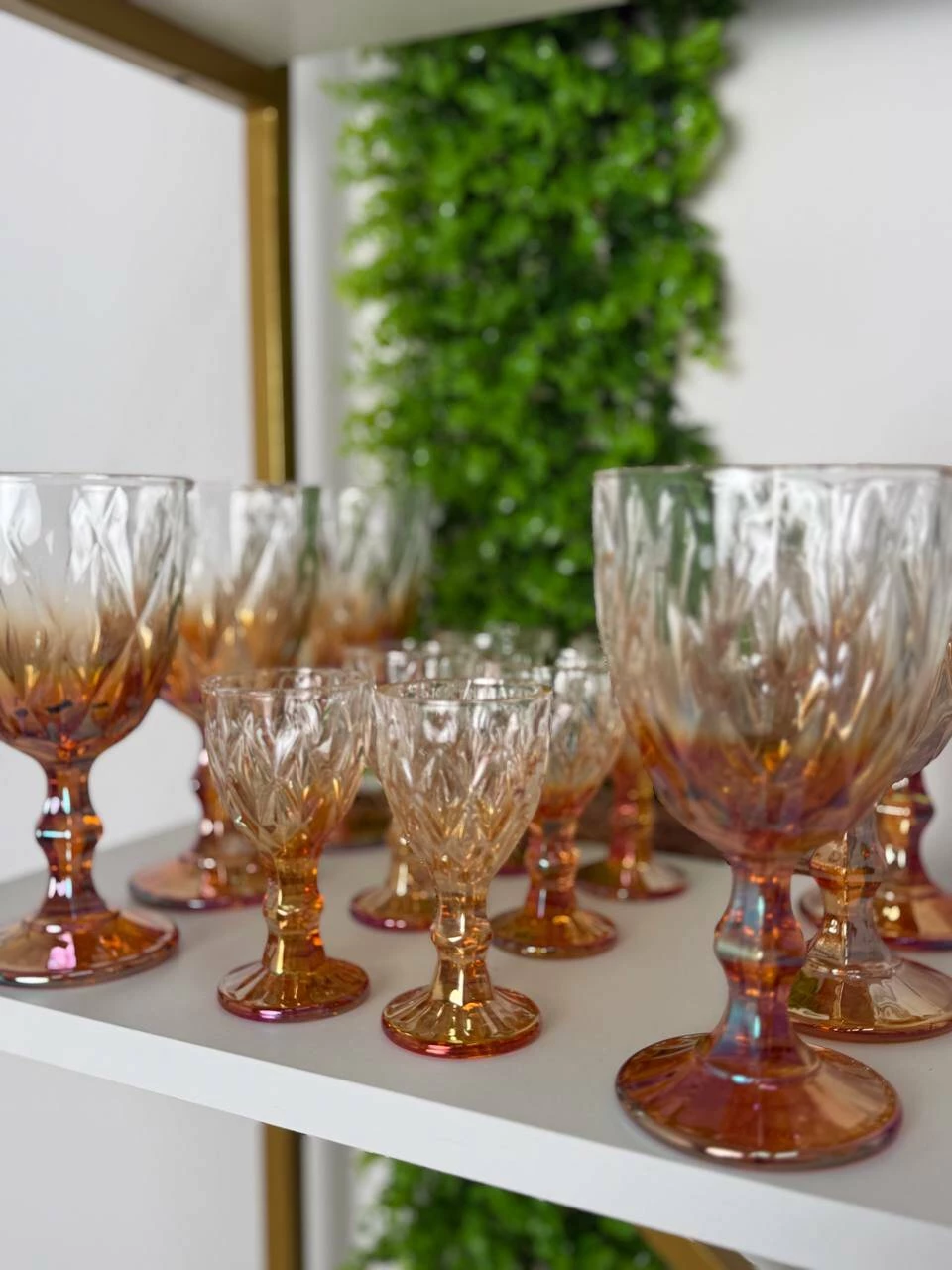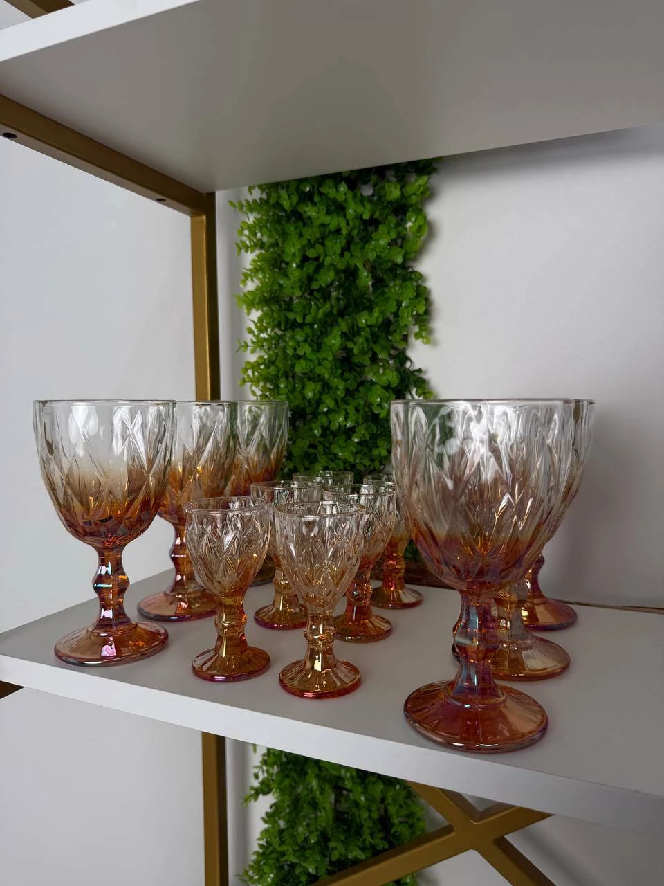 Un set spectaculos, realizat din sticlă de calitate, cu un design elegant ce combină transparența delicată cu nuanțe calde de amber auriu și reflexii irizate. Fiecare pahar atrage privirea prin detaliile texturate și jocul subtil de culori, oferind un aspect luxos și modern.