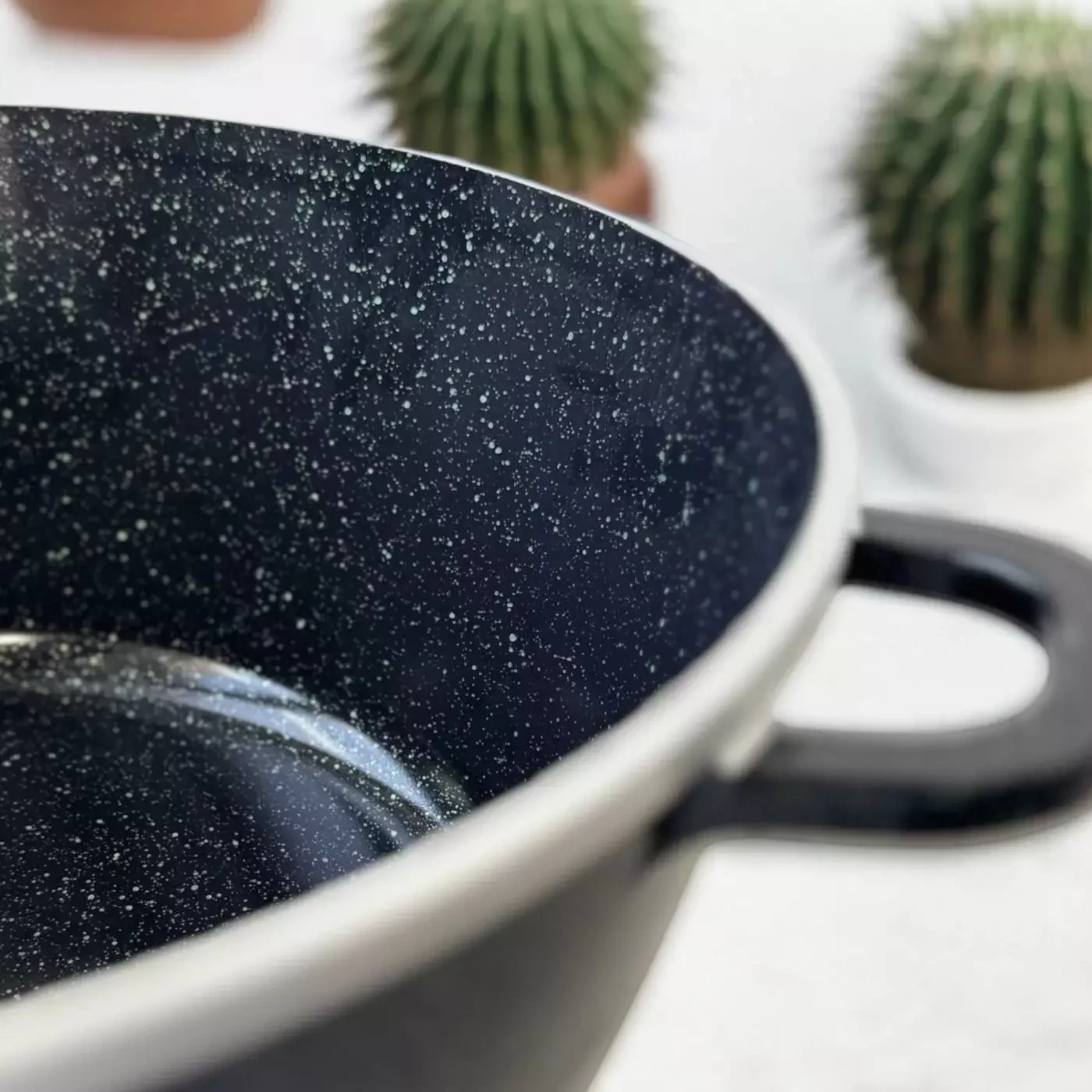 Învelișul antiaderent revoluționar cu pete se mândrește cu eliberare rapidă pentru gătit fără efort. Atrăgătoare pentru ochi, această acoperire ultra durabilă are o inimă de piatră – este rezistentă la furculiță, la metal și extrem de rezistent la zgârieturi, mărind durata de viață a tigaii. Suprafața ușor de curățat asigură că nu se pierde timp la spălare și că se poate petrece mai mult timp pentru gătit. Fabricat din cel mai pur aluminiu din industrie, corpul turnat sub presiune a oalelor de gătit se încălzește rapid și uniform, fără puncte fierbinți. De trei ori mai eficient din punct de vedere energetic decât fonta, aluminiul este, de asemenea, minunat de ușor, eliminând orice efort la braț. Manerul ergonomic cu doua ofera o prindere confortabila pentru control maxim. Cu Dessini, experimentați ușurința expertizei antiaderente. Caracteristici și detalii. pe întreaga suprafață a tigaii Există o varietate de culori din care puteți alege, ușor de utilizat. O oală multifuncțională, bucurați-vă de timpul de coacere, puteți face o varietate de alimente. SĂNĂTOS și UȘOR DE CURĂȚAT: Acoperire ceramică stratificată cu piatră naturală de granit. Proprietățile superioare antiaderente nu necesită utilizarea intensă a uleiului de gătit. Acoperirea ceramică este rezistentă la pete și zgârieturi.