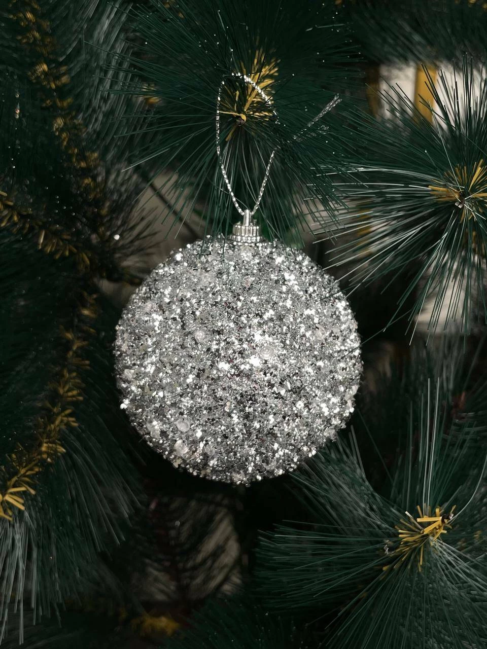Acest set de trei globuri decorative argintii aduce un plus de eleganță și luminozitate oricărui brad de Crăciun. Fiecare glob este acoperit uniform cu paiete fine, oferind un efect strălucitor intens, perfect pentru decorurile moderne sau clasice de sărbători.