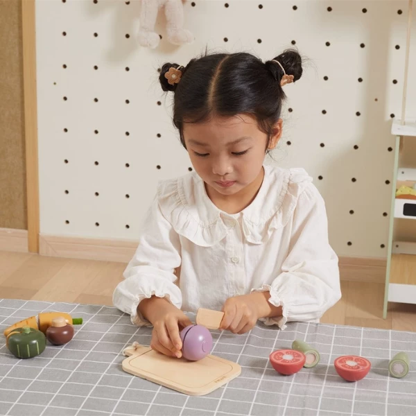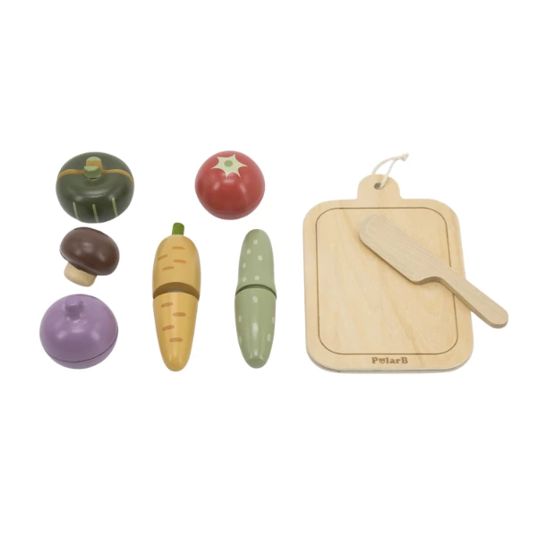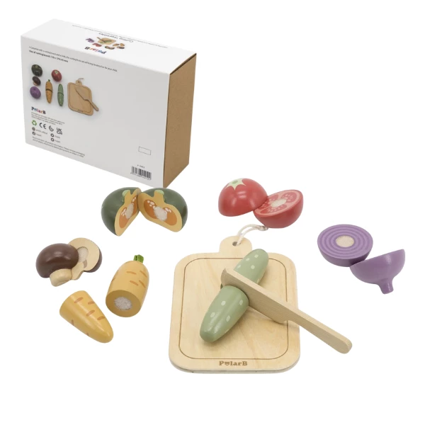 Setul de joacă din lemn PolarB Viga Toys „Legume de tăiat” este cadoul perfect pentru micii bucătari și chef-i. Copiii pot dezvolta imaginația, motricitatea fină și coordonarea mână–ochi, pregătind mâncare pentru păpuși și jucării de pluș.