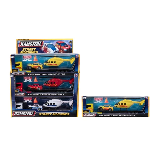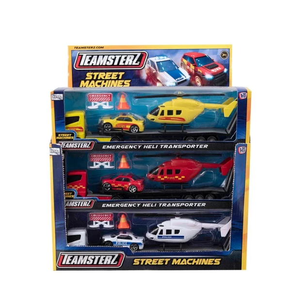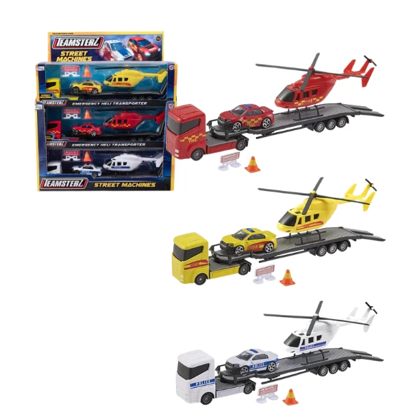 Transportator și vehicul din metal turnat, foarte detaliat, cu detalii modelate la partea inferioară. Roți care se mișcă liber pentru distracție în timpul jocului. Include un vehicul de urgență, un elicopter și un transportator cu detalii autentice și atrăgătoare.