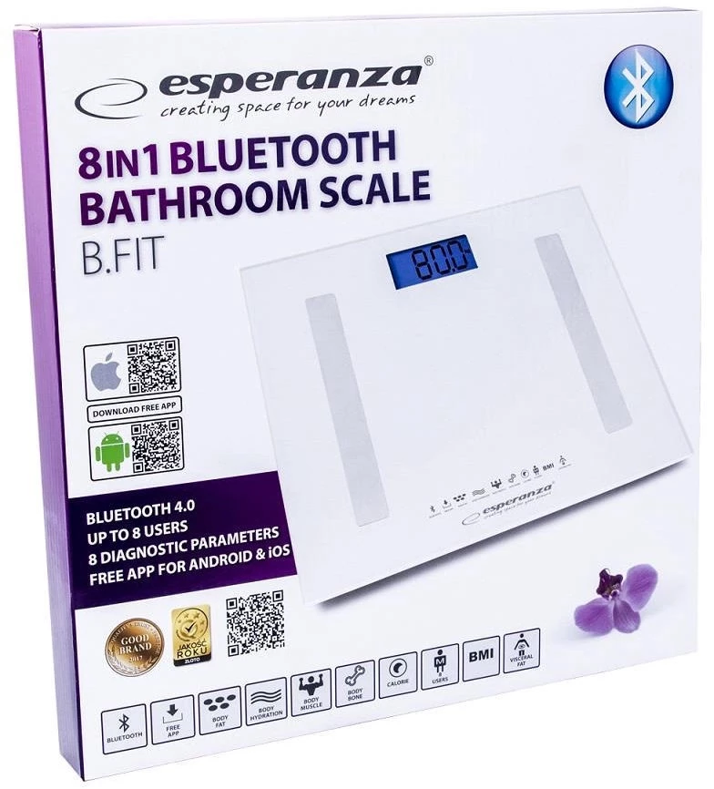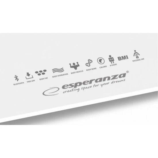 Bluetooth Scale Esperanza 8in1 EBS016W White, measurement: body weight [kg], body fat content [%], water content in the body [%], muscle weight [kg], bone weight [kg], visceral fat index, body mass index (BMI), identification of the optimal calorie intake [kcal]