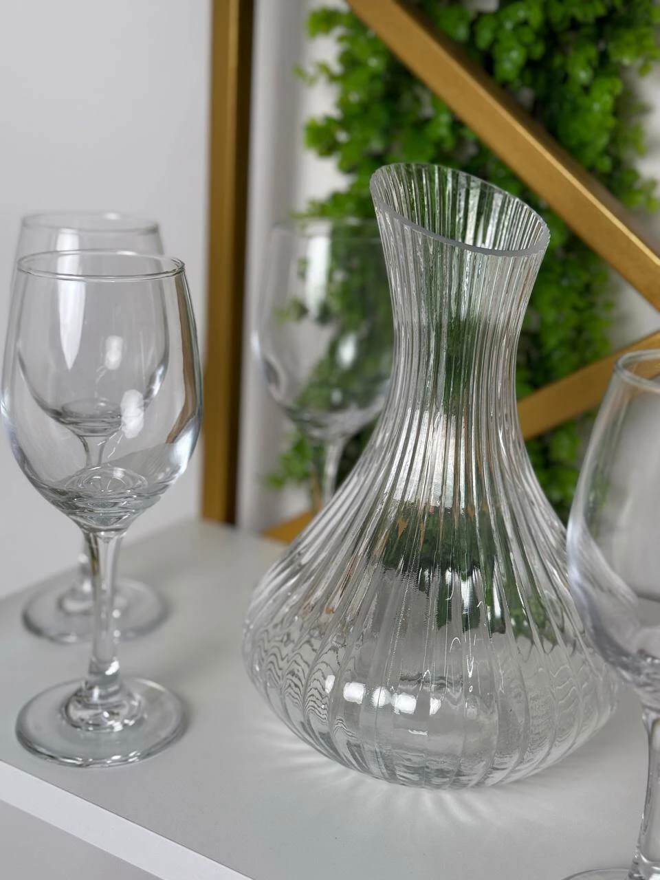 Набор включает декантер и 6 бокалов из прозрачного стекла, предназначенных для подачи вина, воды или других напитков. Декантер имеет эргономичный дизайн, который обеспечивает лёгкое наливание и аэрацию вина, а бокалы на ножке создают элегантную и практичную подачу.