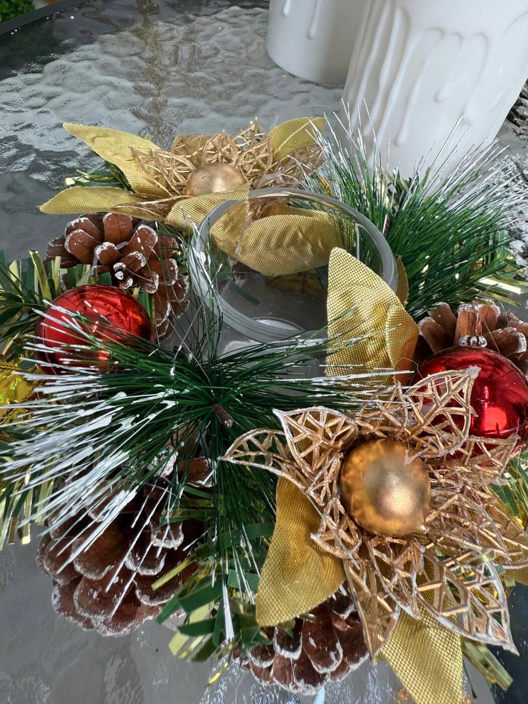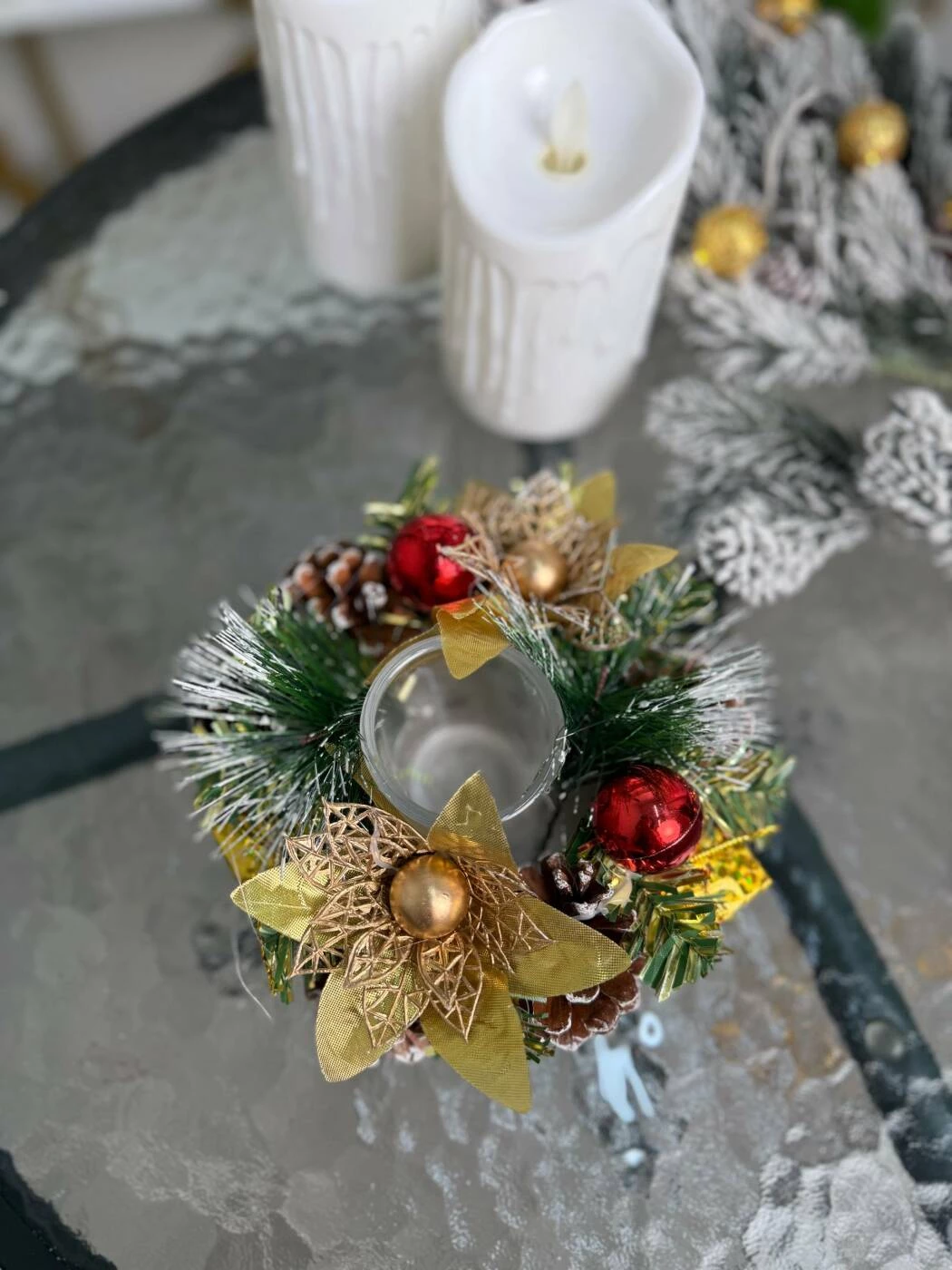 Элегантный и праздничный аксессуар, идеально подходящий для того, чтобы привнести свет и тепло рождественских праздников в ваш дом! Этот декоративный подсвечник выполнен из искусственных зелёных веточек, шишек, красных шариков и золотистых декоративных цветов, образуя утончённый рождественский веночек.