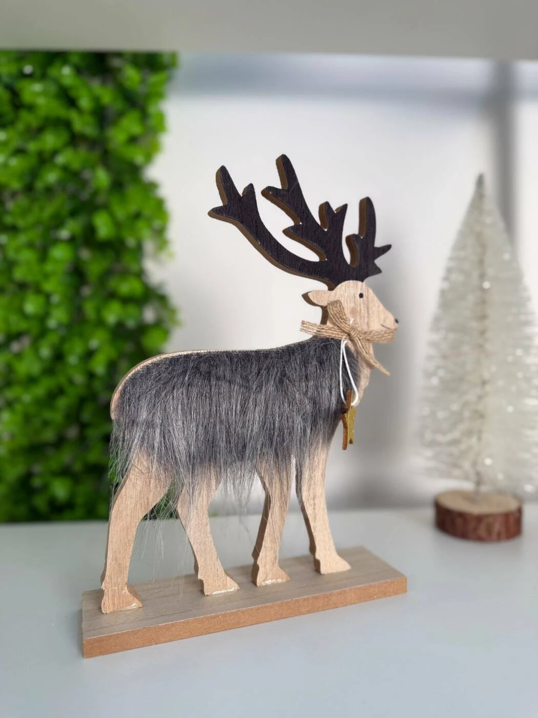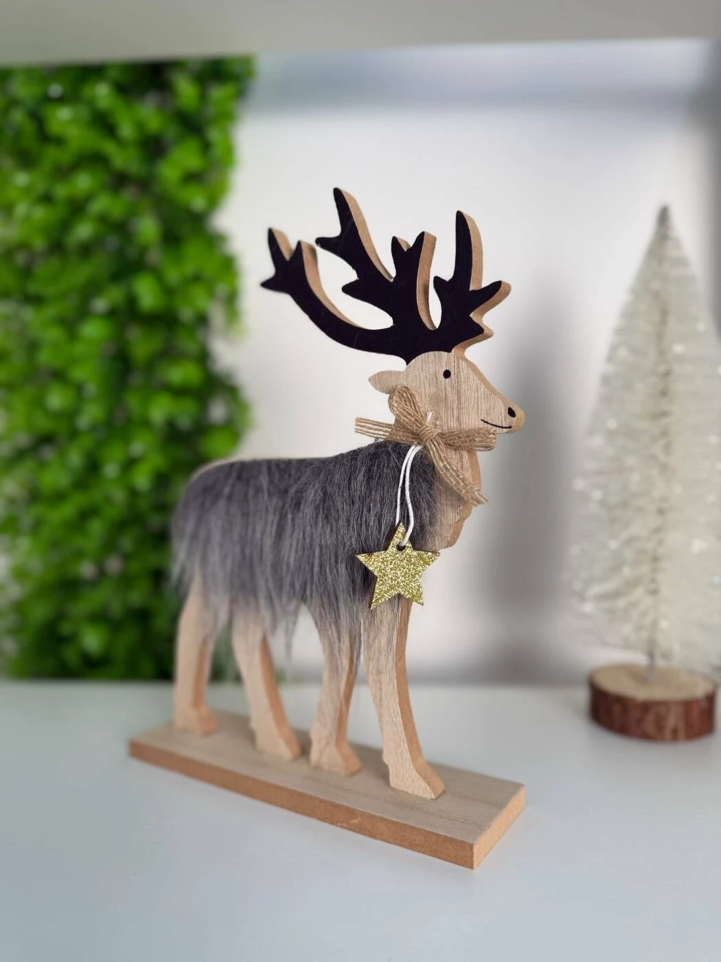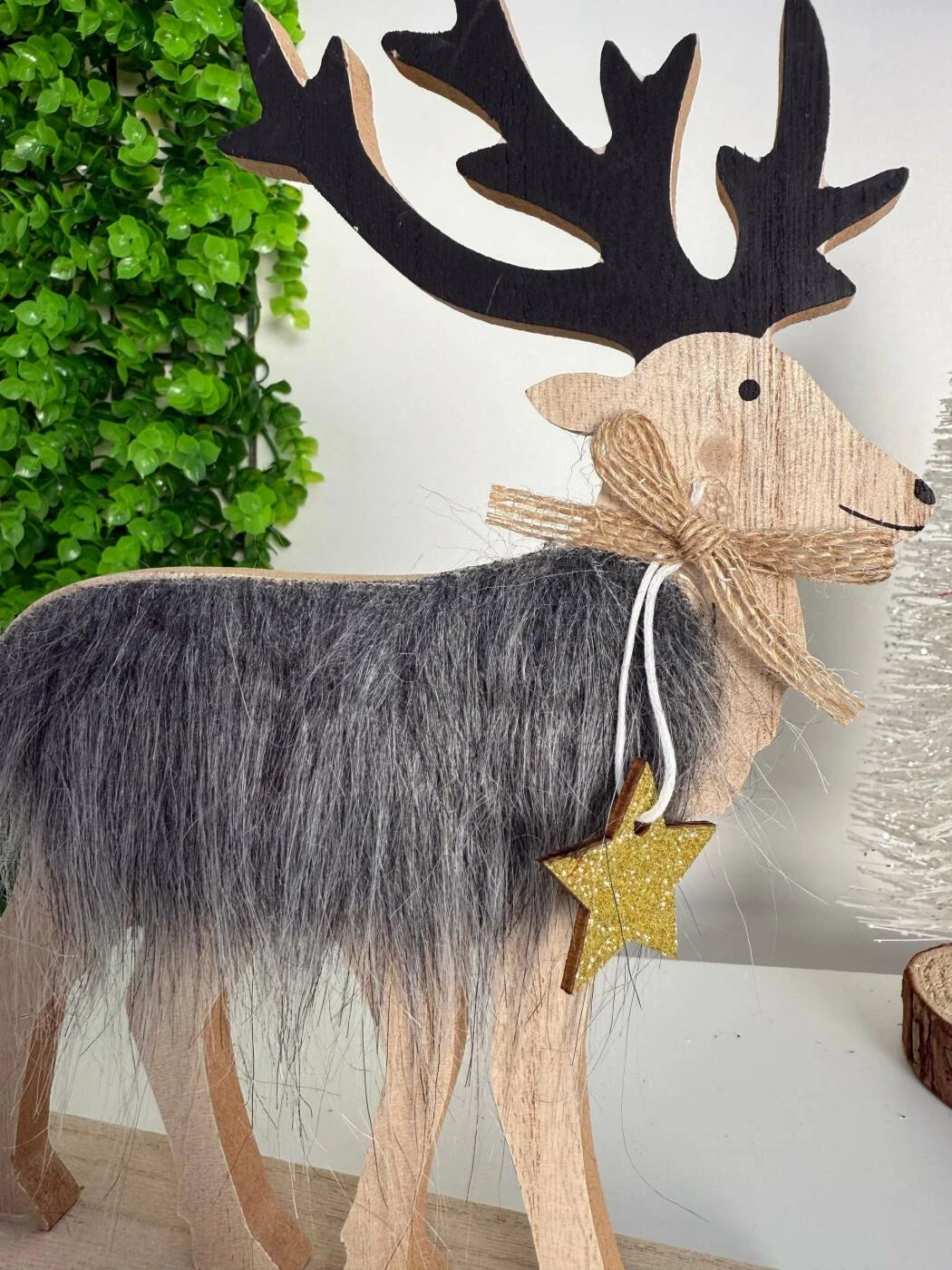 Эта декоративная фигурка в форме оленя выполнена из дерева и сочетает в себе простоту деревенского стиля с элегантными зимними акцентами. Тело украшено мягким мехом, а на шее — бечёвка с блестящей золотой звёздочкой, придающей изделию праздничный и утончённый вид.