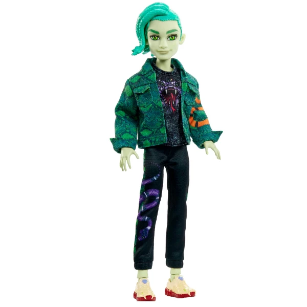 С графической футболкой, курткой с принтом под кожу змеи и брюками с змеиным узором кукла Deuce Gorgon демонстрирует устрашающе мод ...