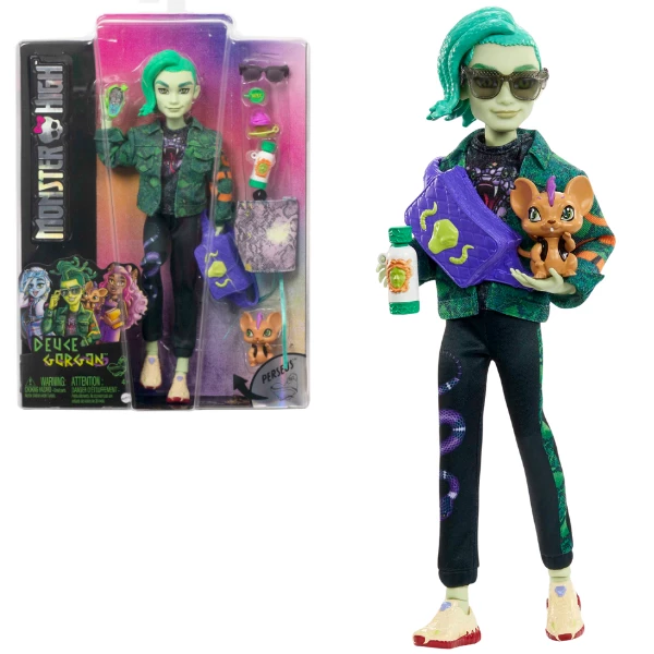 С графической футболкой, курткой с принтом под кожу змеи и брюками с змеиным узором кукла Deuce Gorgon демонстрирует устрашающе модный стиль. Очки в стиле тонированных и фантастические кроссовки дополняют образ. Змеиные волосы не являются оправданием для "утреннего петушка", поэтому кукла Deuce Gorgon всегда имеет под рукой баночку с воском для волос из змей - идеальное средство для создания его узнаваемой прически. Фиолетовая поясная сумка отлично подходит для хранения монструозно важных вещей: чешуйчатого фартука для рабочих смен в "Кофейне гробовщика", декоративной бутылки для воды, змеиных деталей смартфона и кекса для поддержания энергии в движении! Маленький, но могучий, Персей - его любимый мышонок, который всегда рядом в увлекательных приключениях, вызывающих дрожь в спине.