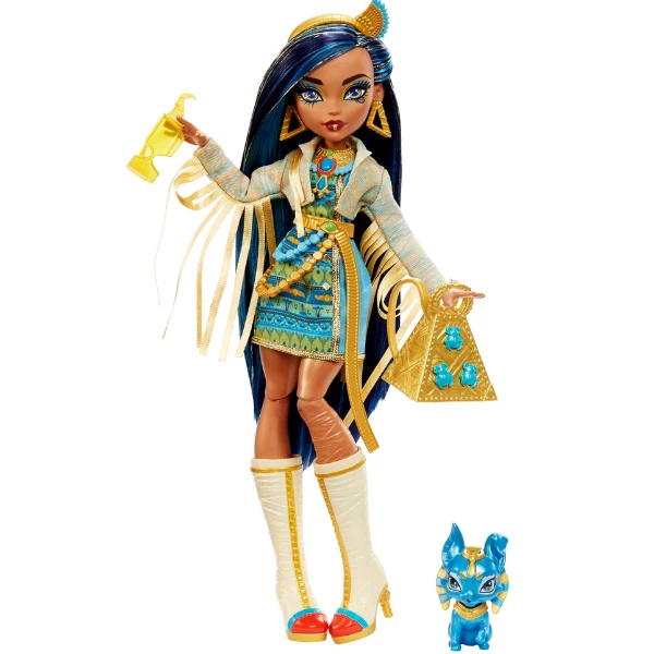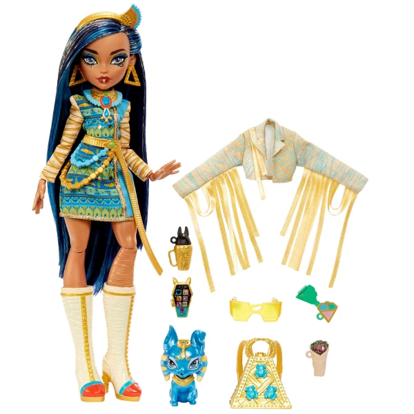 Кукла Monster High Клео — дочь Мумии. Кукла имеет модный наряд, подчеркивающий оригинальный стиль ее героини. Модница Клео выглядит ужасно-блестяще, одетая в голубовато-золотистое платье с длинными рукавами, напоминающими обмотки мумии, и очень стильный пояс-цепочка. Ее изящный стиль дополняют такие аксессуары как высокие сапоги в тон одежды, безумно крутые бусы, серьги, гламурные солнцезащитные очки. А чтобы придать ей большую индивидуальность в наборе есть также роскошная куртка, рюкзак-пирамида, украшенный скарабеями, бурито, напиток, смартфон и палетка косметики. Не менее милым выглядит ее маленький любимец — Тут!