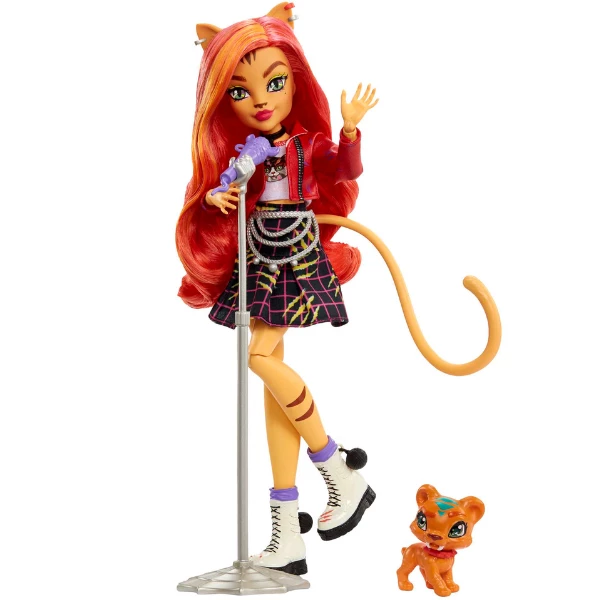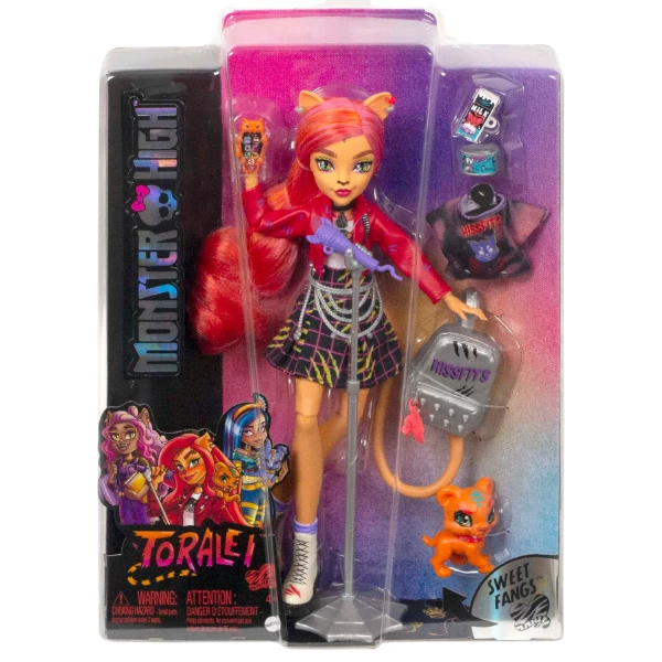 Торалей Страйп кукла выглядит потрясающе в своем потрясающем стиле, включающем клетчатую юбку с деталями в виде царапин и куртку мото, надетую поверх футболки с милой и страшной графикой кота. Ее великолепный образ дополняется цепным поясом, подвеской на шее и боевыми ботинками с акцентами в виде клубка пряжи; она также готова выйти на сцену со своим микрофоном и микрофонным стендом! Захватывающие истории онары включают футболку и металлический, украшенный заклепками рюкзак с надписью "Hissfits", закуски молока и корма для кота, смартфон и ее страшно-милого питомца, Свит Фангс. С гибкостью в туловище, локтях, запястьях и коленях поклонники могут запечатлеть куклу Торалей Страйп в самых разных монструозных позах.
