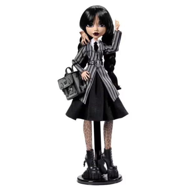 Образ куклы:Одетая в культовую униформу Nevermore Academy, она полностью соответствует своему экранному образу.Ее волосы заплетены в фирменные косы, а макияж подчеркивает мрачную харизму.На плече расположился её верный друг Тинг (Thing), готовый к новым приключениям!